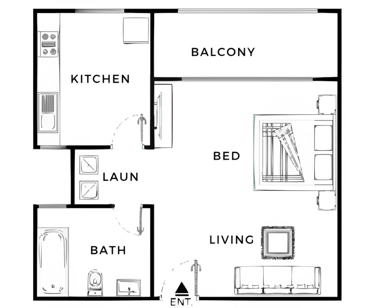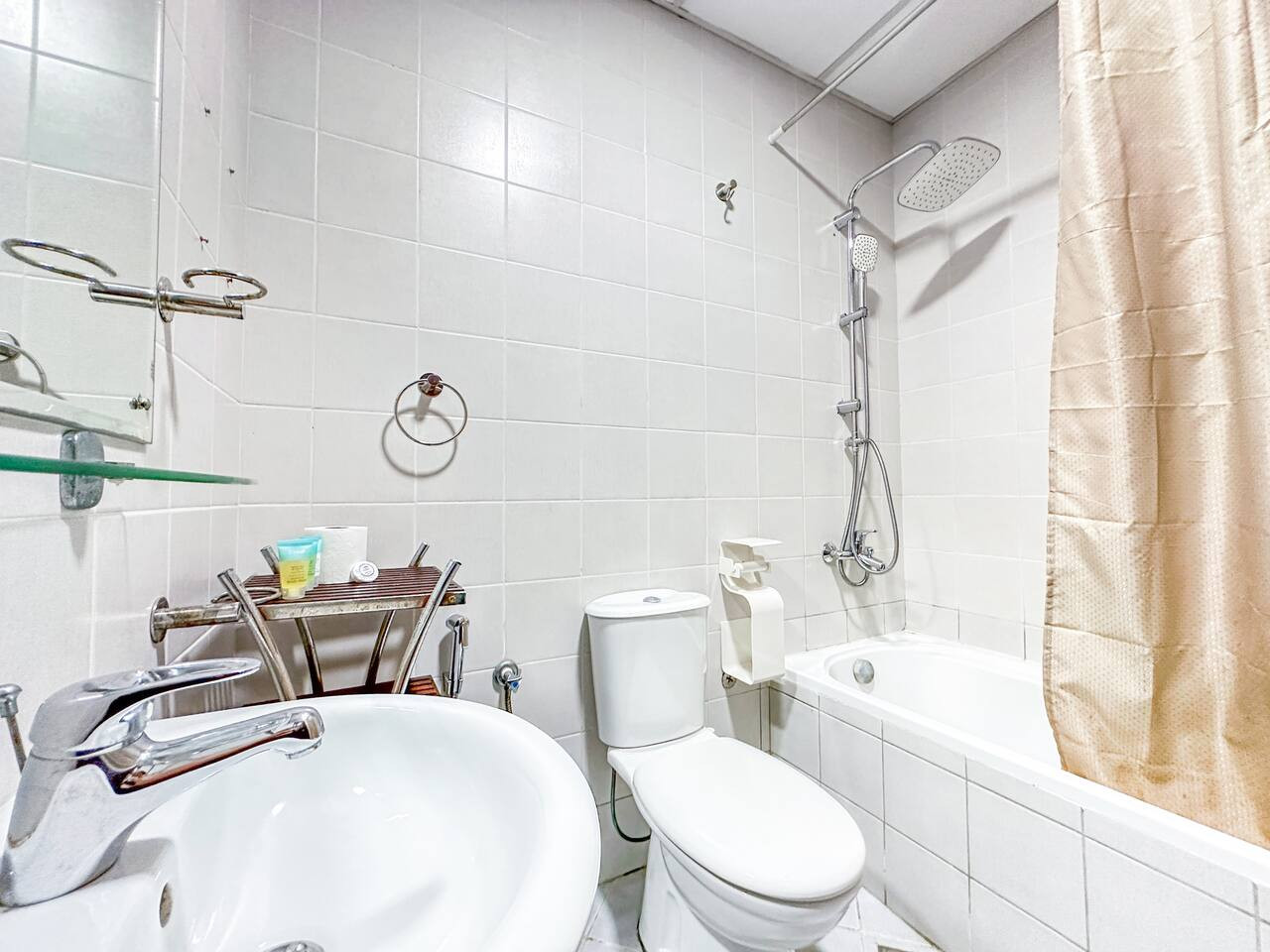This one-bathroom studio is equipped with all the essentials, including a bathtub and shower.