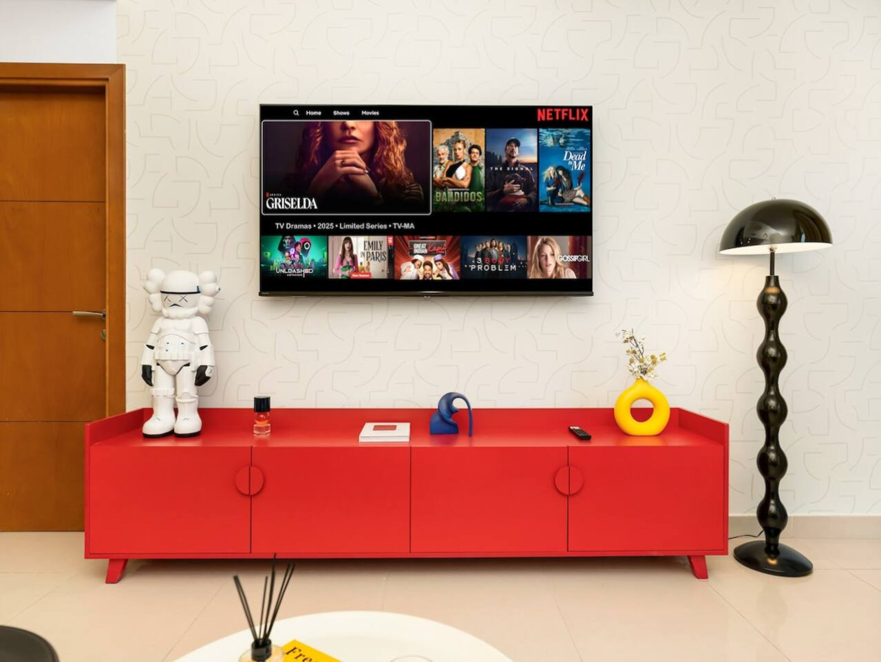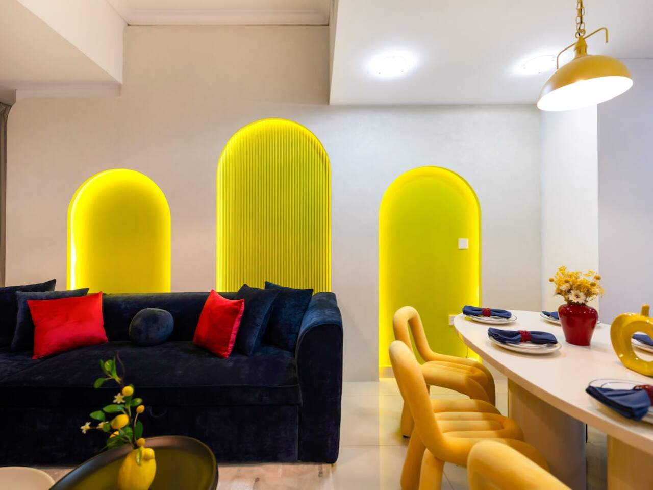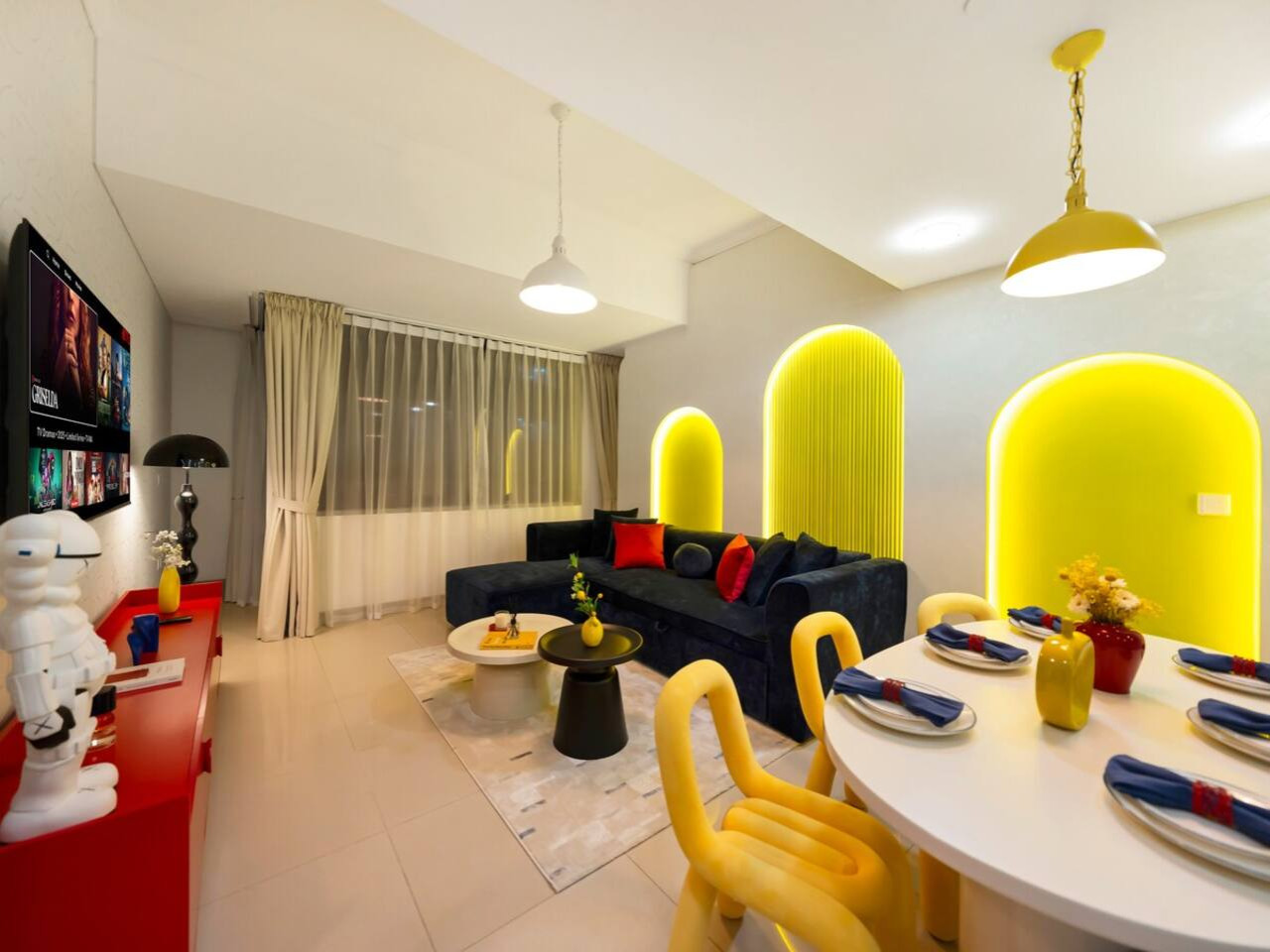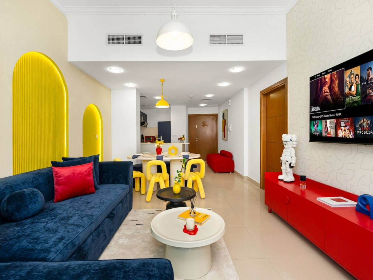 The apartment’s central living room has been thoughtfully designed to provide a relaxing and elegant space. It features a large, comfortable sofa bed and custom-made furnishings for a luxurious ambiance.
