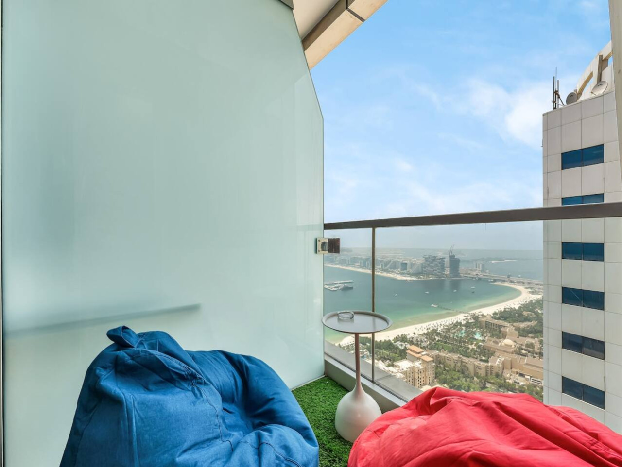 – First Bedroom: Queen-size bed (2 guests) + Sofa bed (2 guests) with a private balcony and stunning views of Palm Jumeirah and the sea.