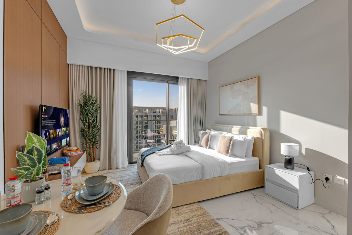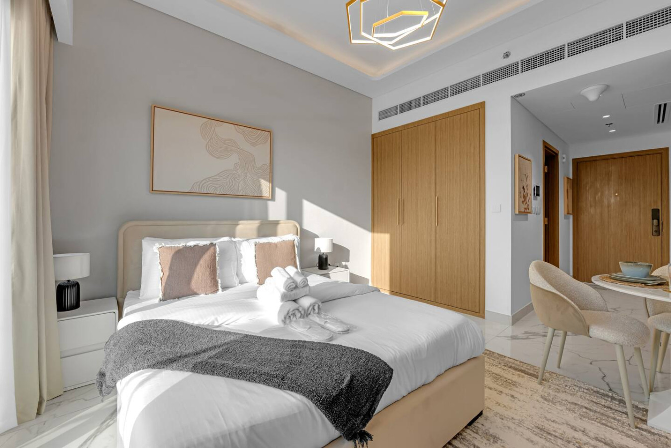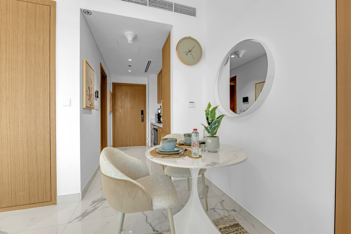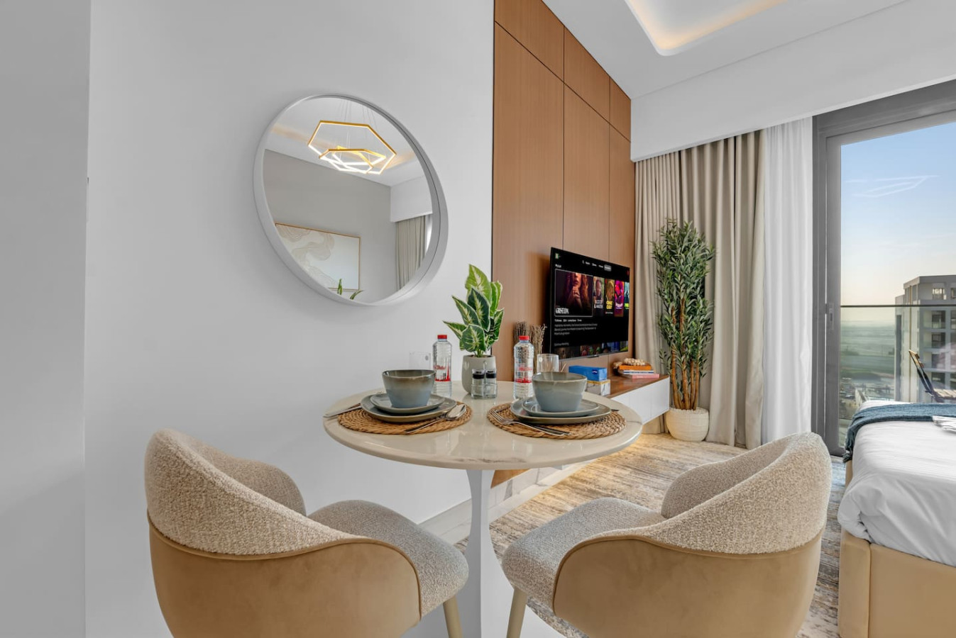 This stylish studio offers a sophisticated home away from home in Dubai. The open-plan layout features a comfortable bed, a designer kitchenette, and a spa-inspired bathroom with luxury amenities. Bright natural light fills the space, highlighting its contemporary elegance