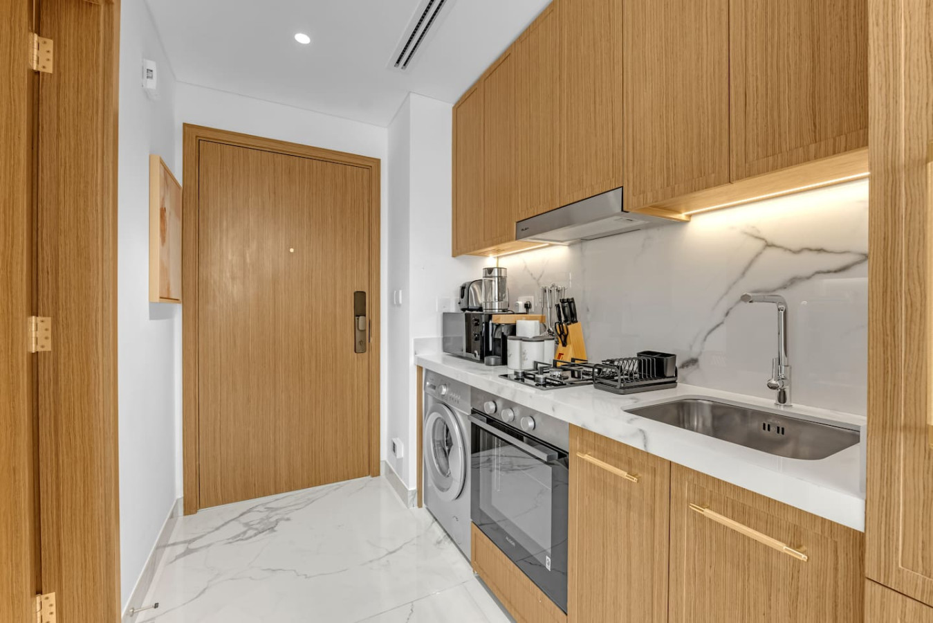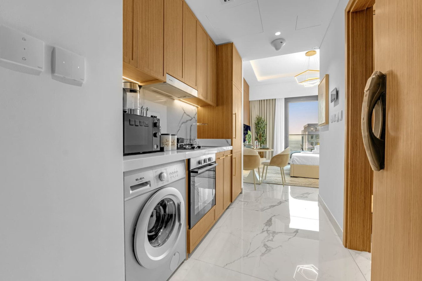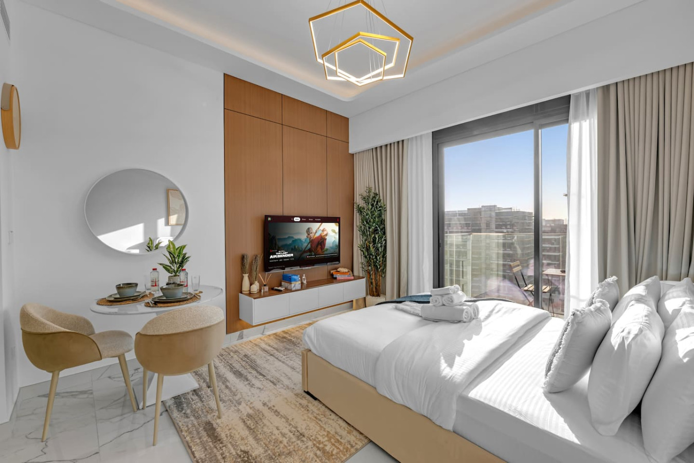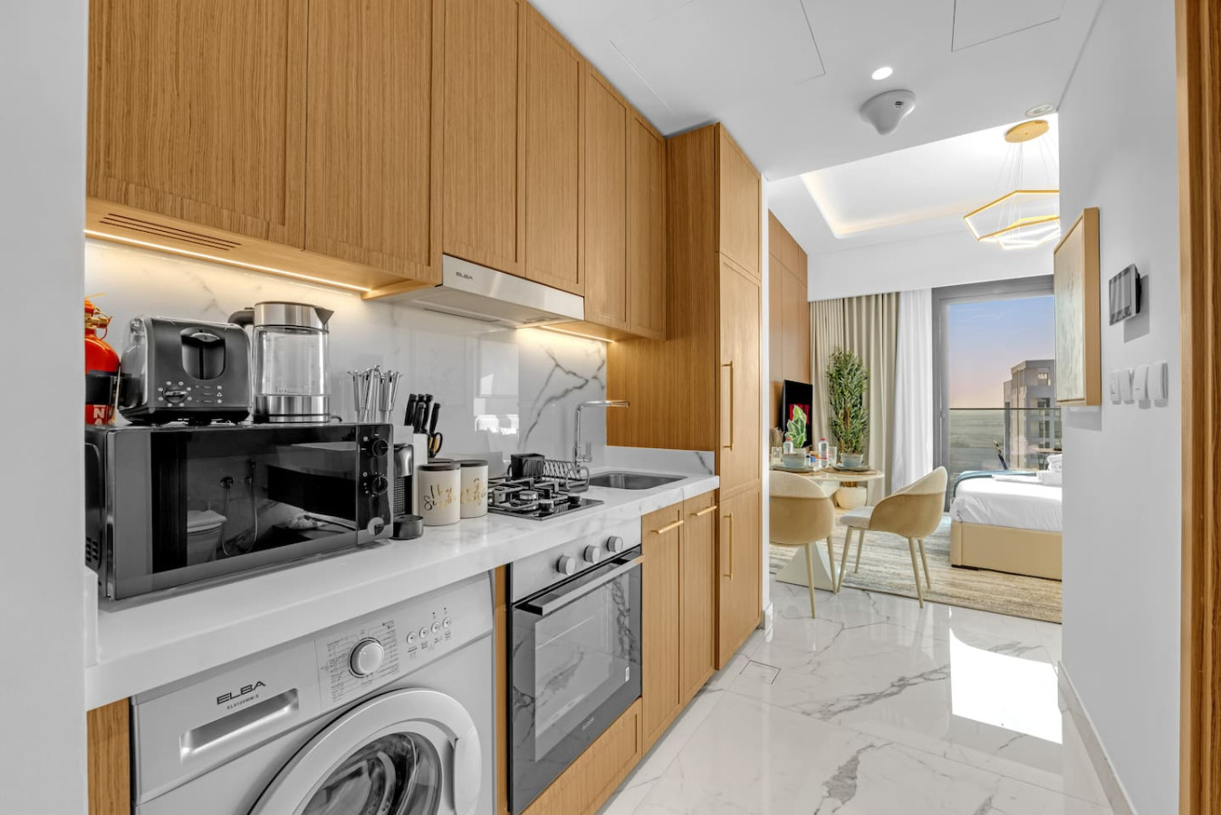 This stylish studio offers a sophisticated home away from home in Dubai. The open-plan layout features a comfortable bed, a designer kitchenette, and a spa-inspired bathroom with luxury amenities. Bright natural light fills the space, highlighting its contemporary elegance