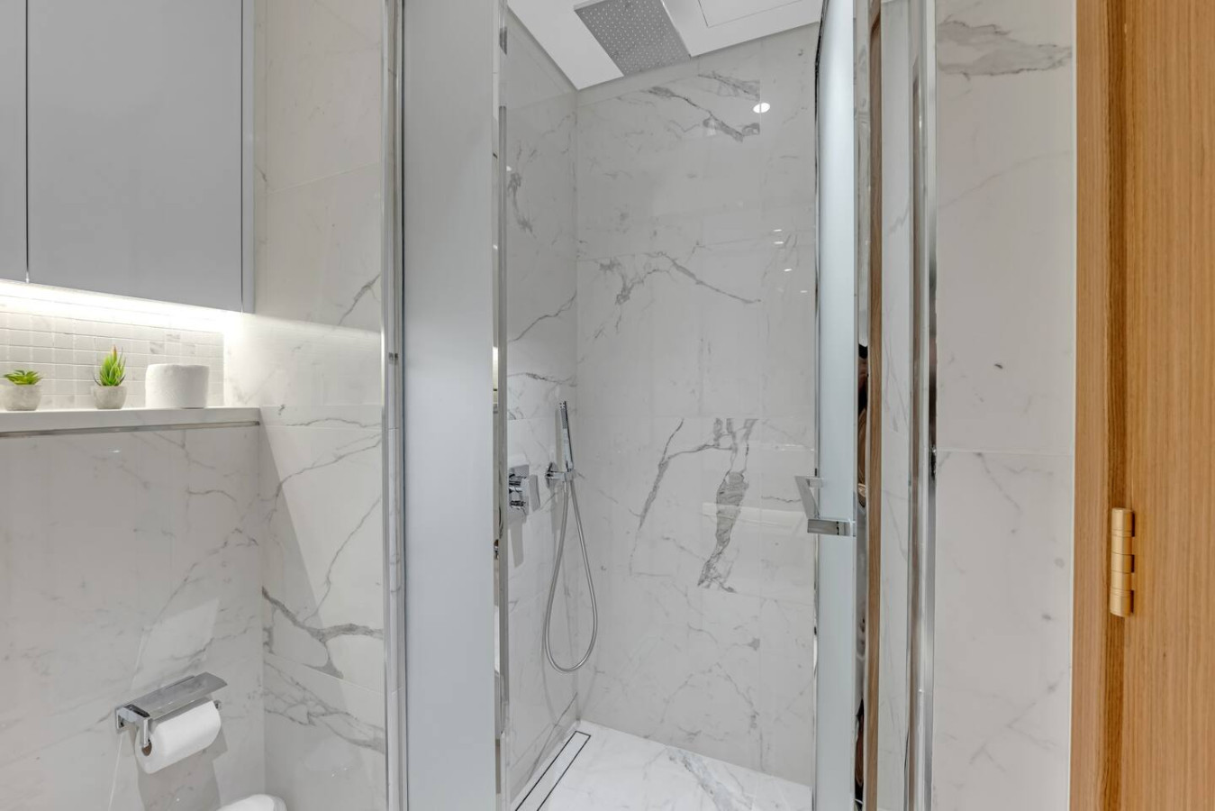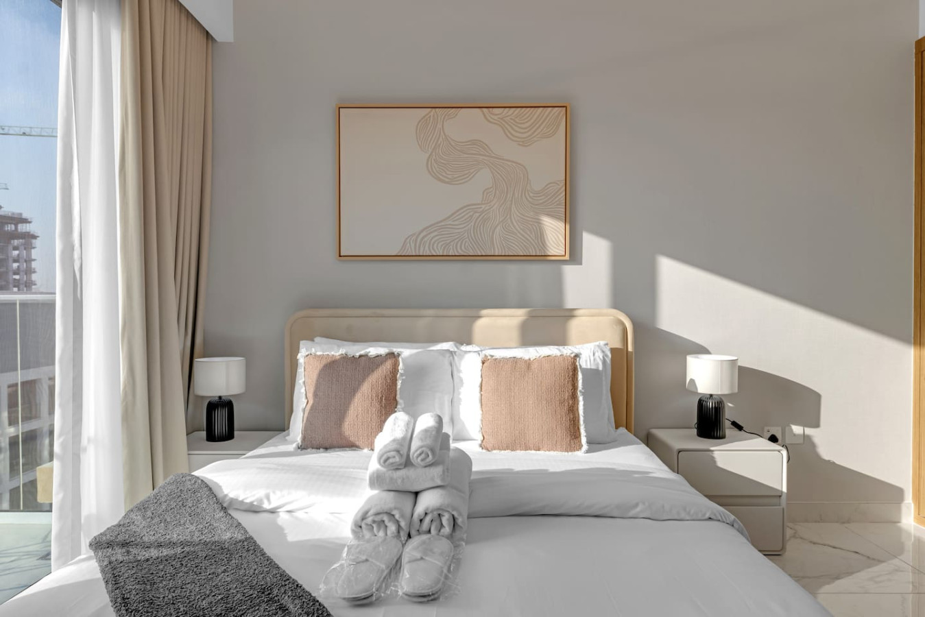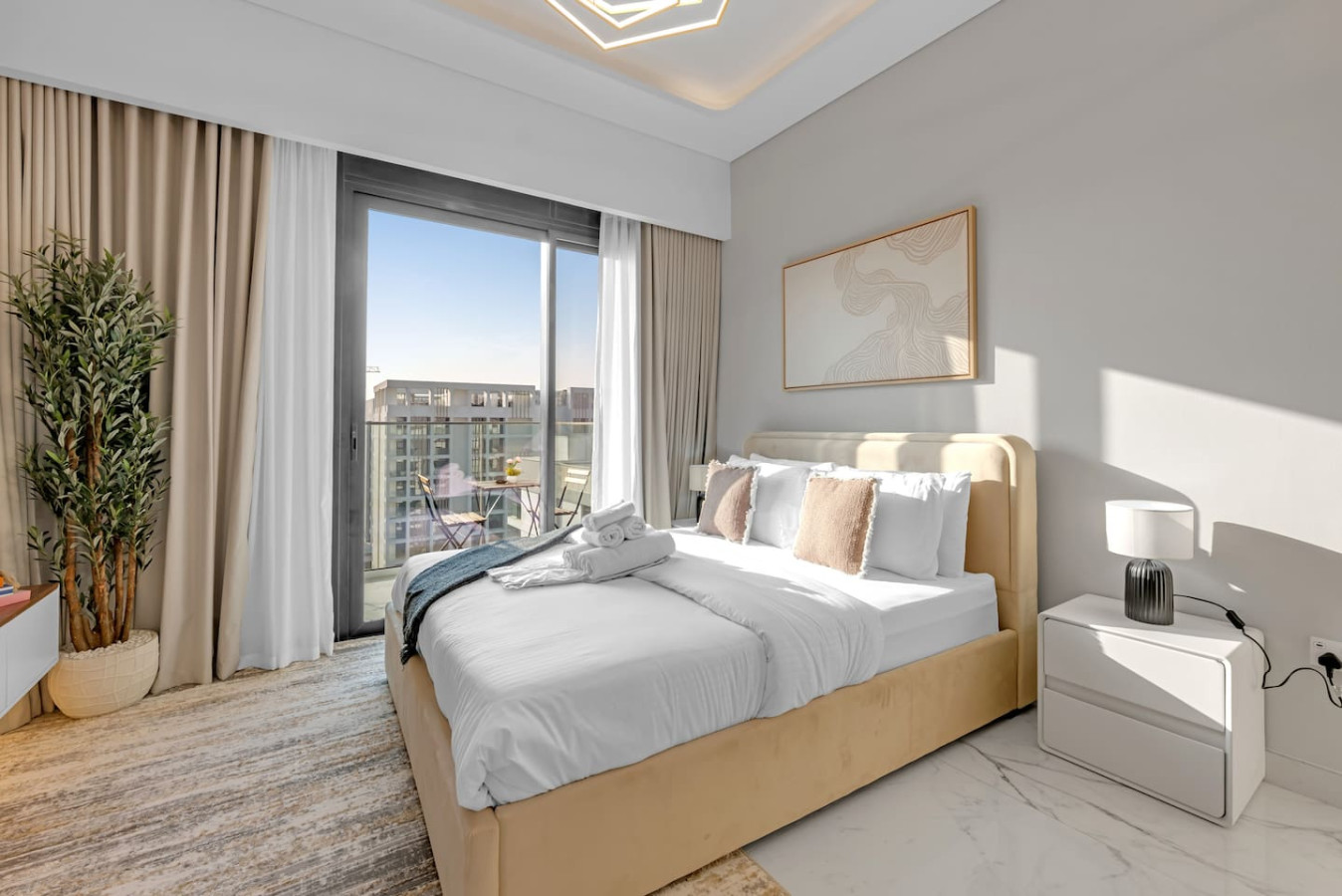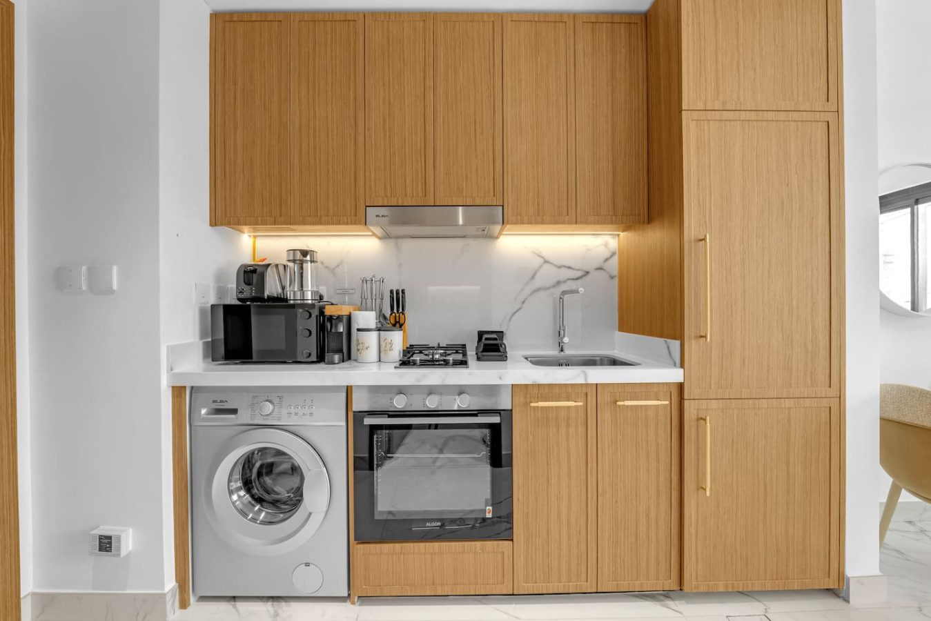 This stylish studio offers a sophisticated home away from home in Dubai. The open-plan layout features a comfortable bed, a designer kitchenette, and a spa-inspired bathroom with luxury amenities. Bright natural light fills the space, highlighting its contemporary elegance