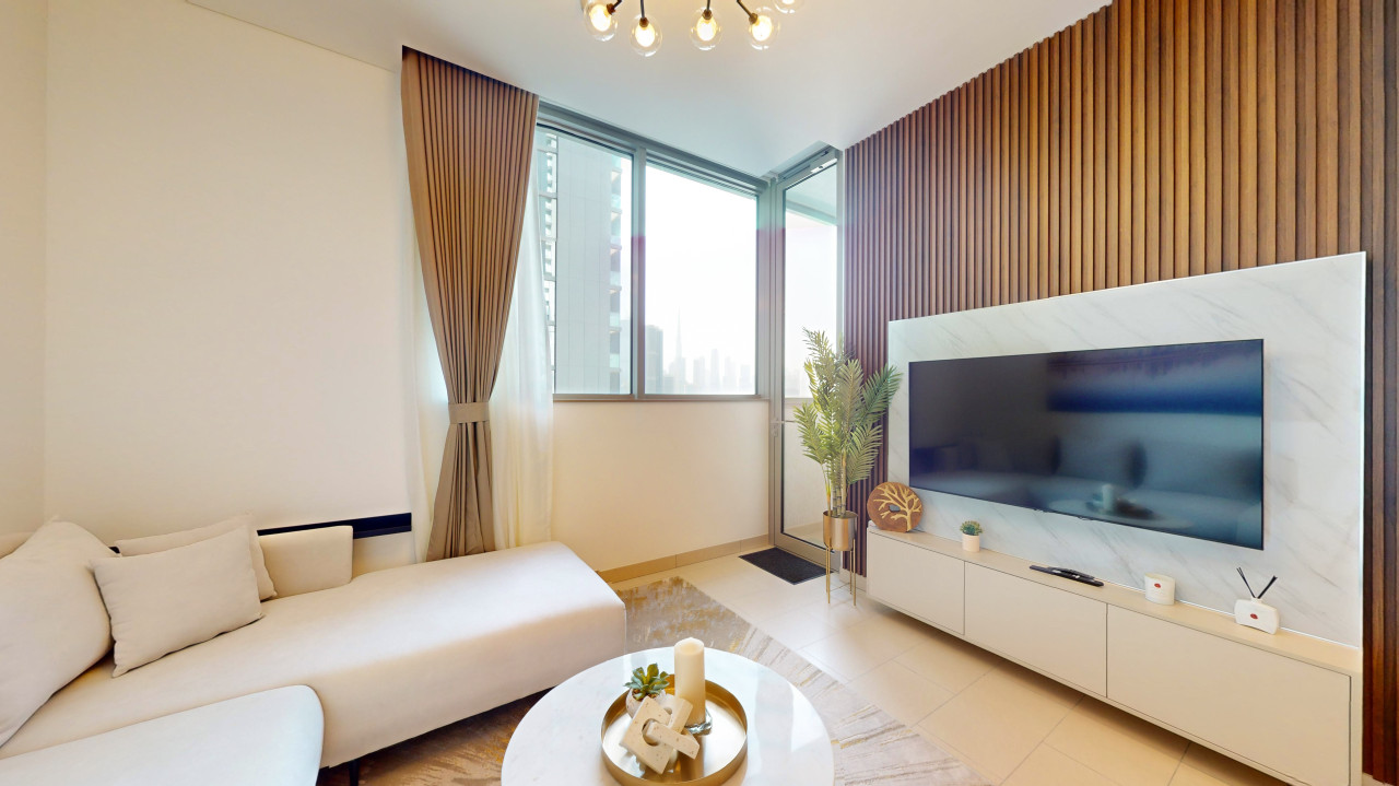 The living area offers a cozy L-shaped sofa, coffee table, and a Smart TV for your entertainment. Step out onto the furnished private balcony with partial views of the Burj Khalifa in the distance.