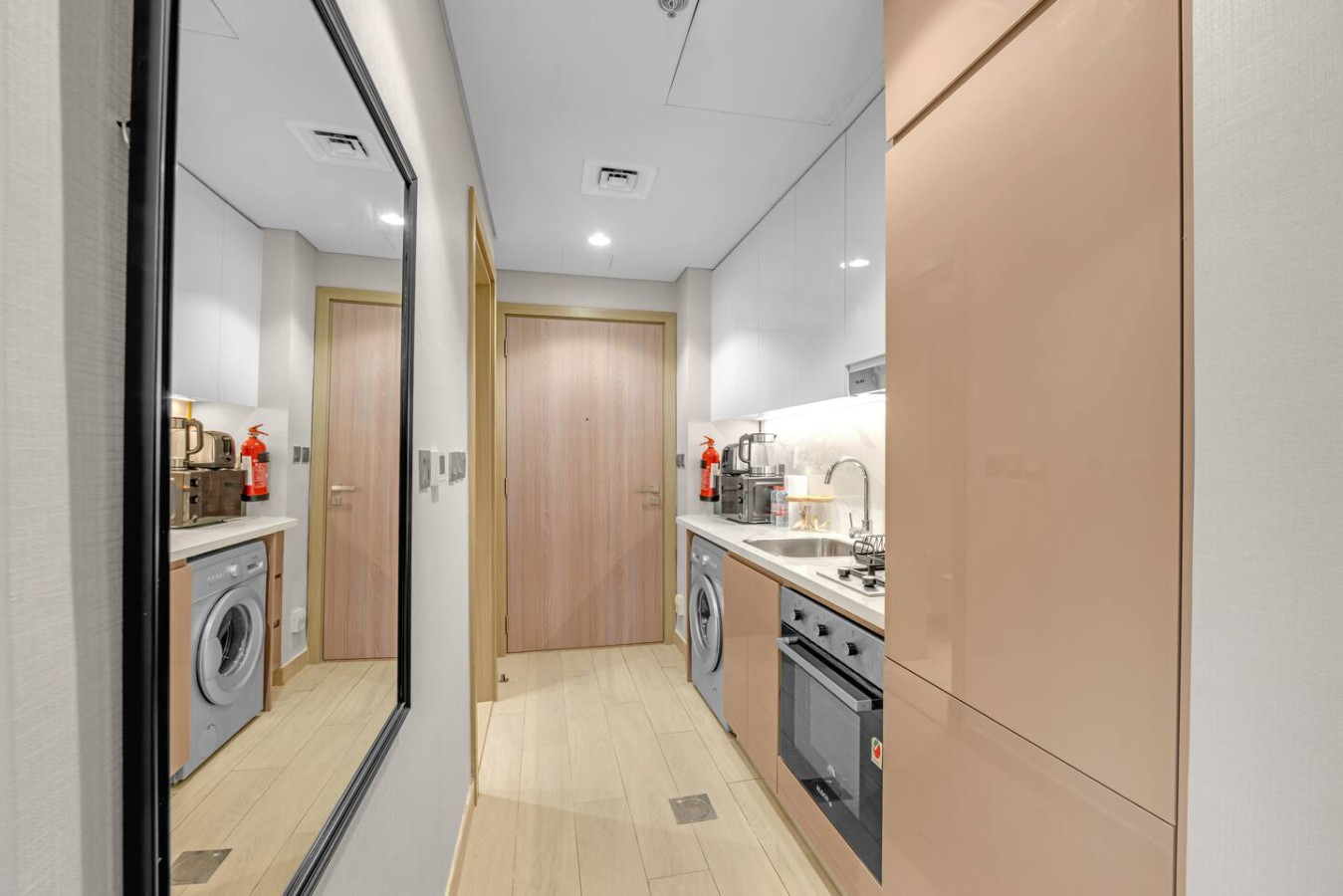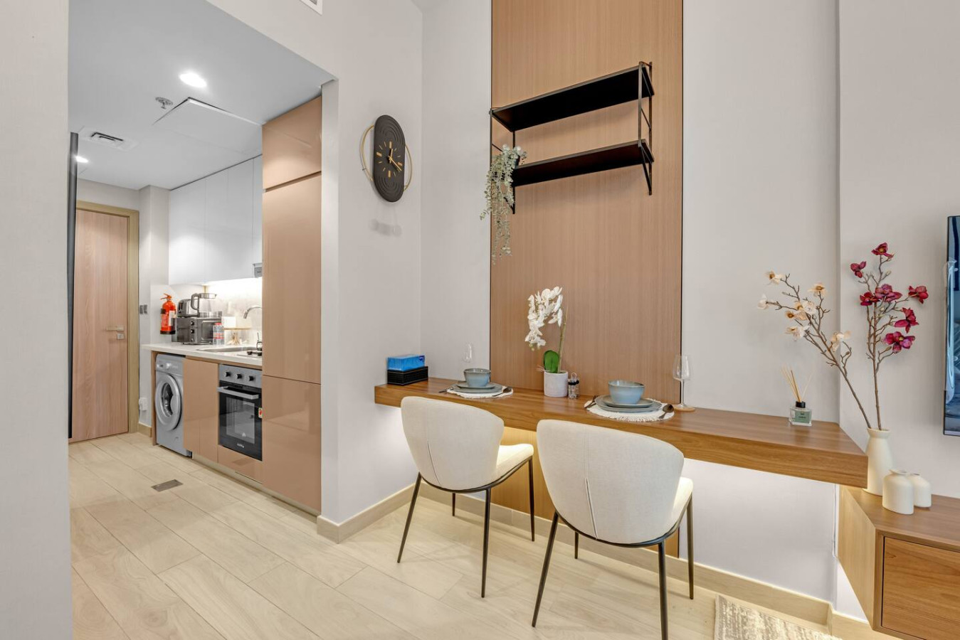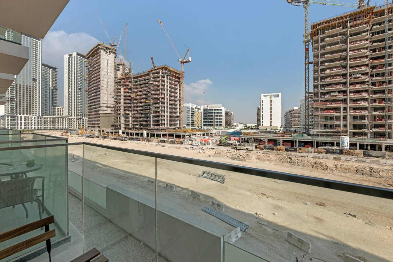 This thoughtfully furnished studio offers a calming, modern aesthetic, natural light, and every essential you need for a smooth stay—from a fully equipped kitchen to relaxing balcony seating with views of the developing Meydan community skyline.