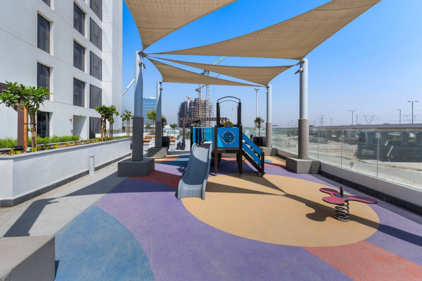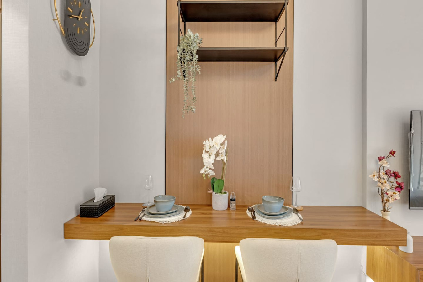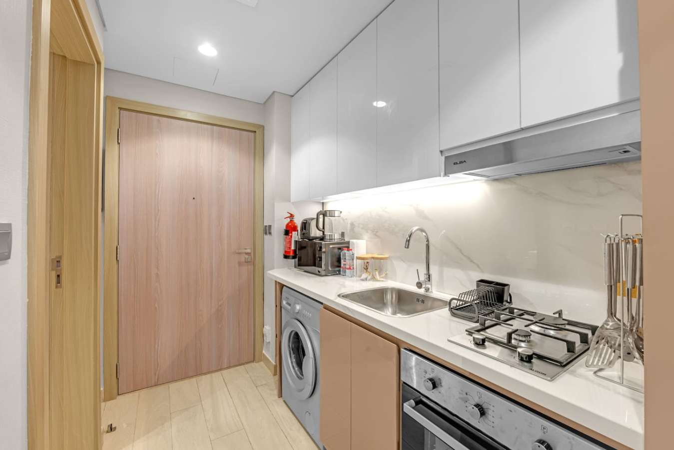 This thoughtfully furnished studio offers a calming, modern aesthetic, natural light, and every essential you need for a smooth stay—from a fully equipped kitchen to relaxing balcony seating with views of the developing Meydan community skyline.