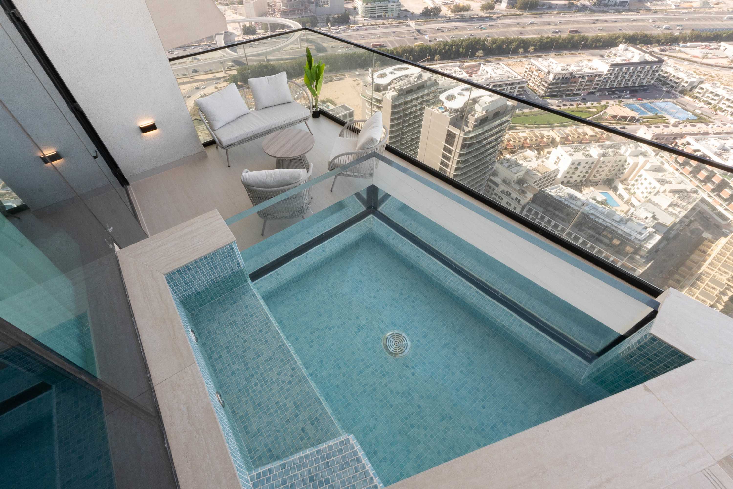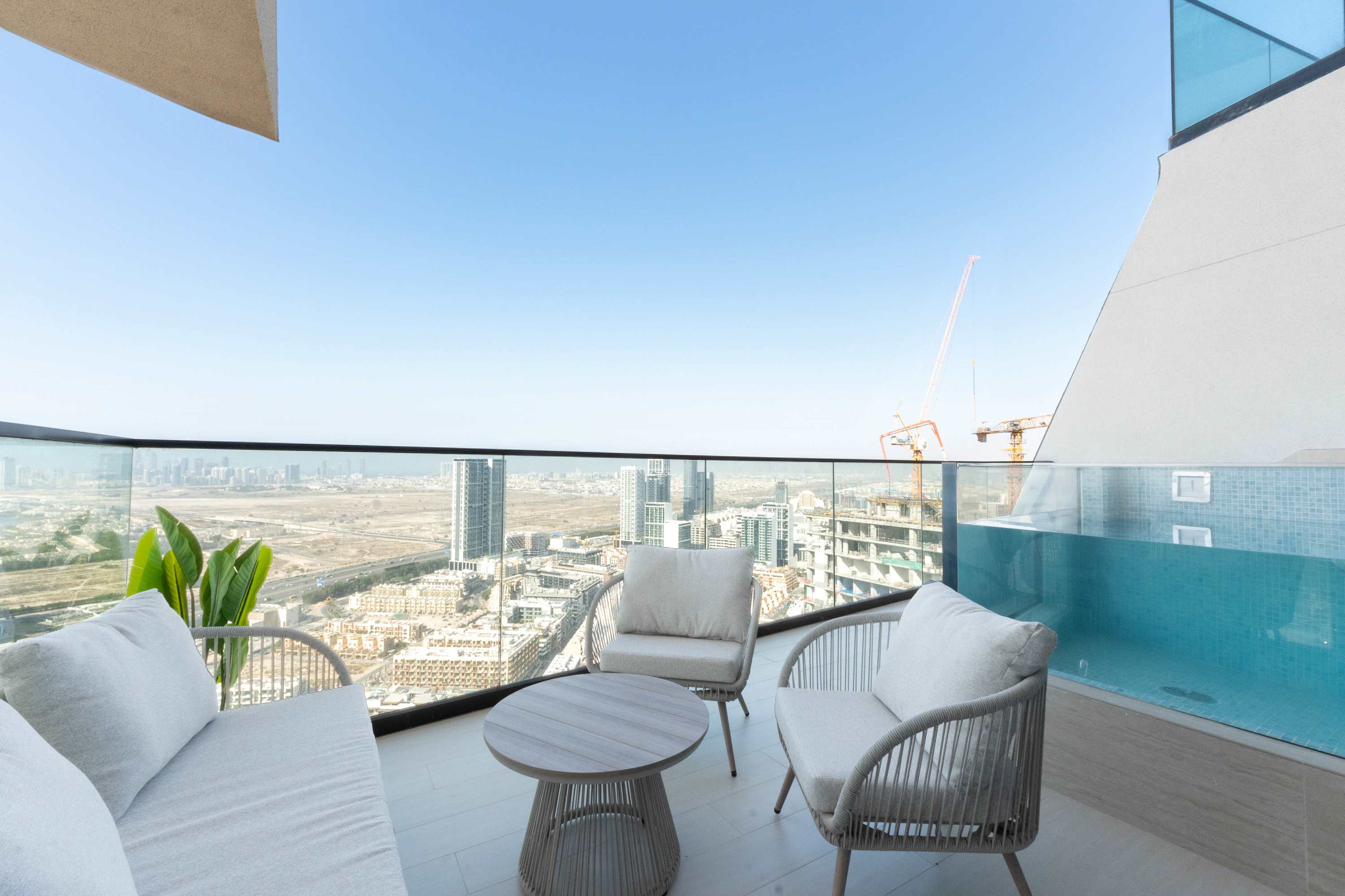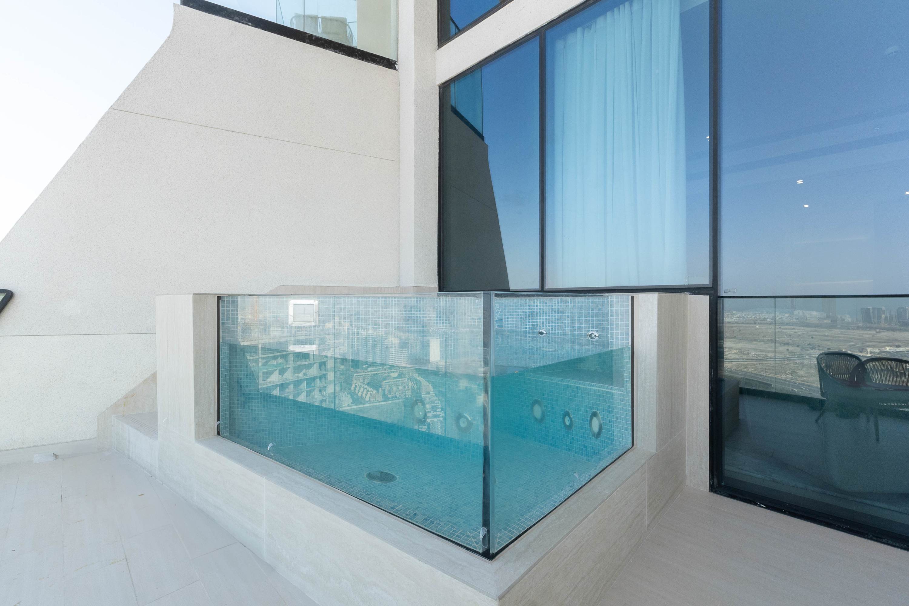 Discover a sophisticated retreat in one of JVC’s newest luxury buildings. This elegant apartment combines refined interiors with a rare private pool on the balcony, offering a peaceful escape above the city. Guests enjoy hotel-level comfort, premium finishes, and access to gym, sauna, and pool facilities. Perfect for travelers seeking exclusivity and style.