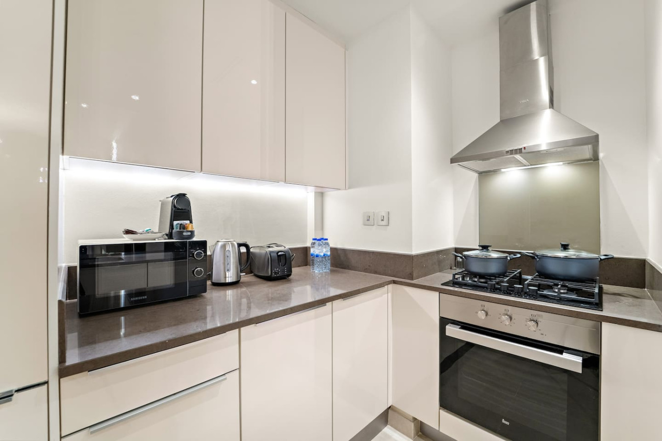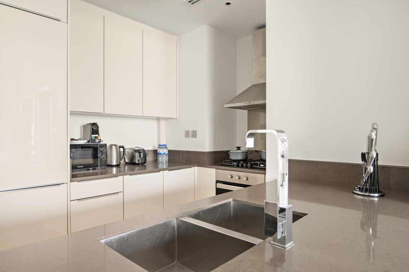 It is fully equipped with stainless-steel cooking appliances that make it suitable for preparing any meal, whether a simple breakfast, quick snack or a three-course gourmet dinner. Spacious quartz countertops and a central kitchen island provide plenty of room to work your MasterChef magic.