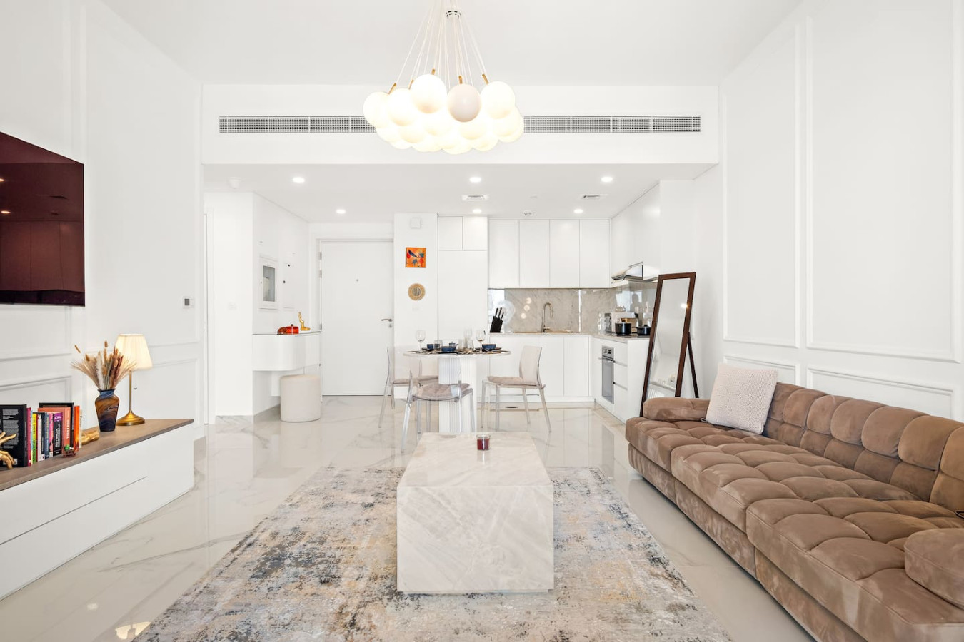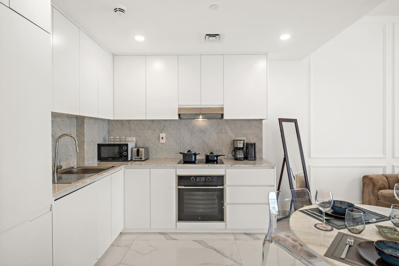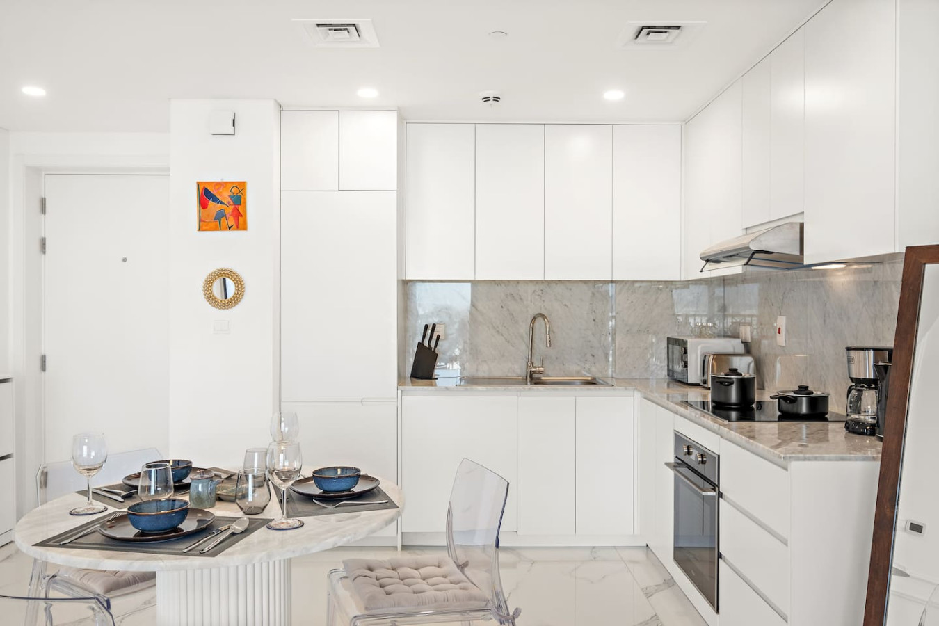 It is fully equipped with stainless-steel cooking appliances that make it suitable for preparing any meal, whether a simple breakfast, quick snack or a three-course gourmet dinner. Spacious quartz countertops and a central kitchen island provide plenty of room to work your MasterChef magic.
