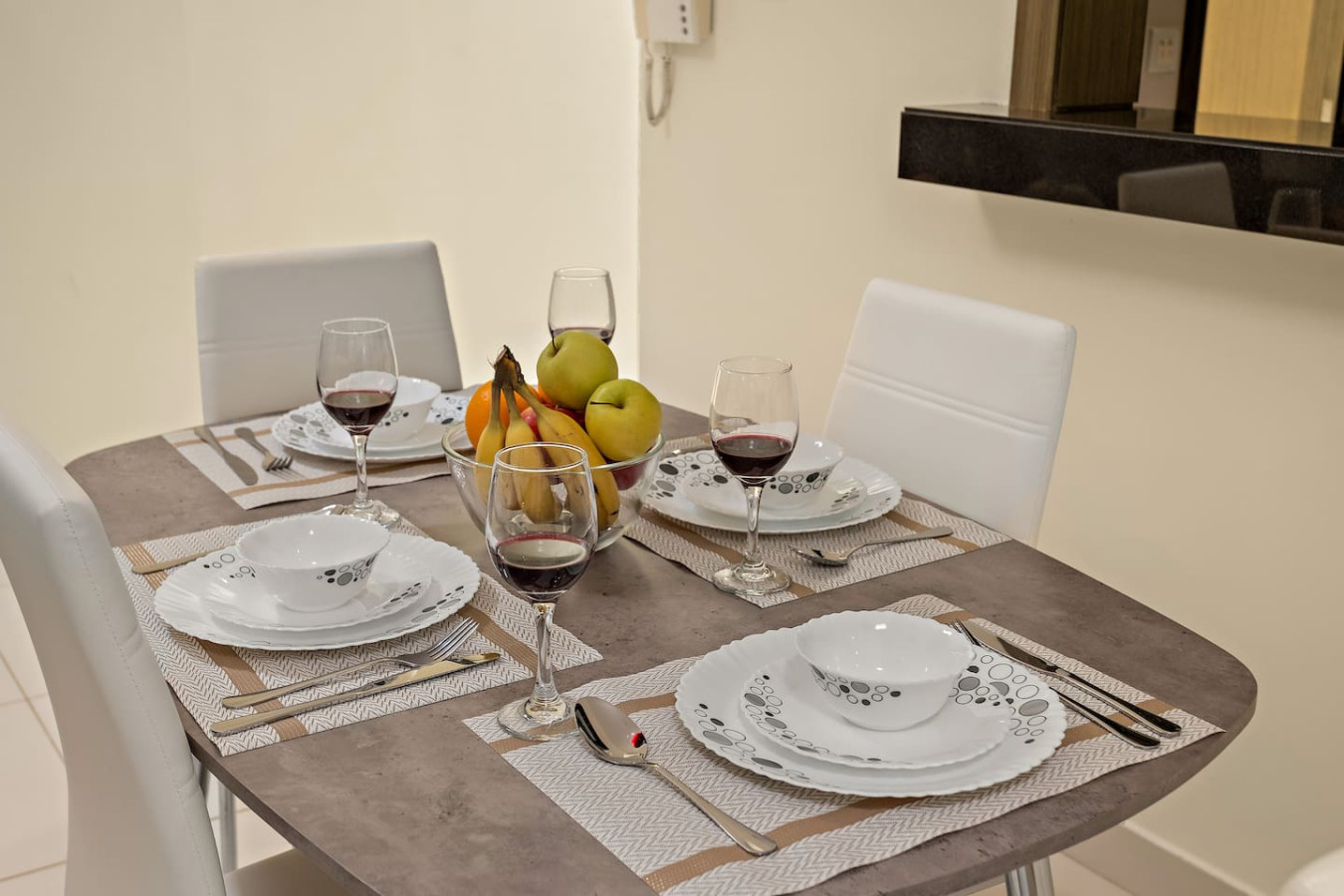 Have a few drinks in the living room while the food is getting ready. Once it’s done, serve it at the inviting dining table and enjoy a tasty meal with your loved ones.