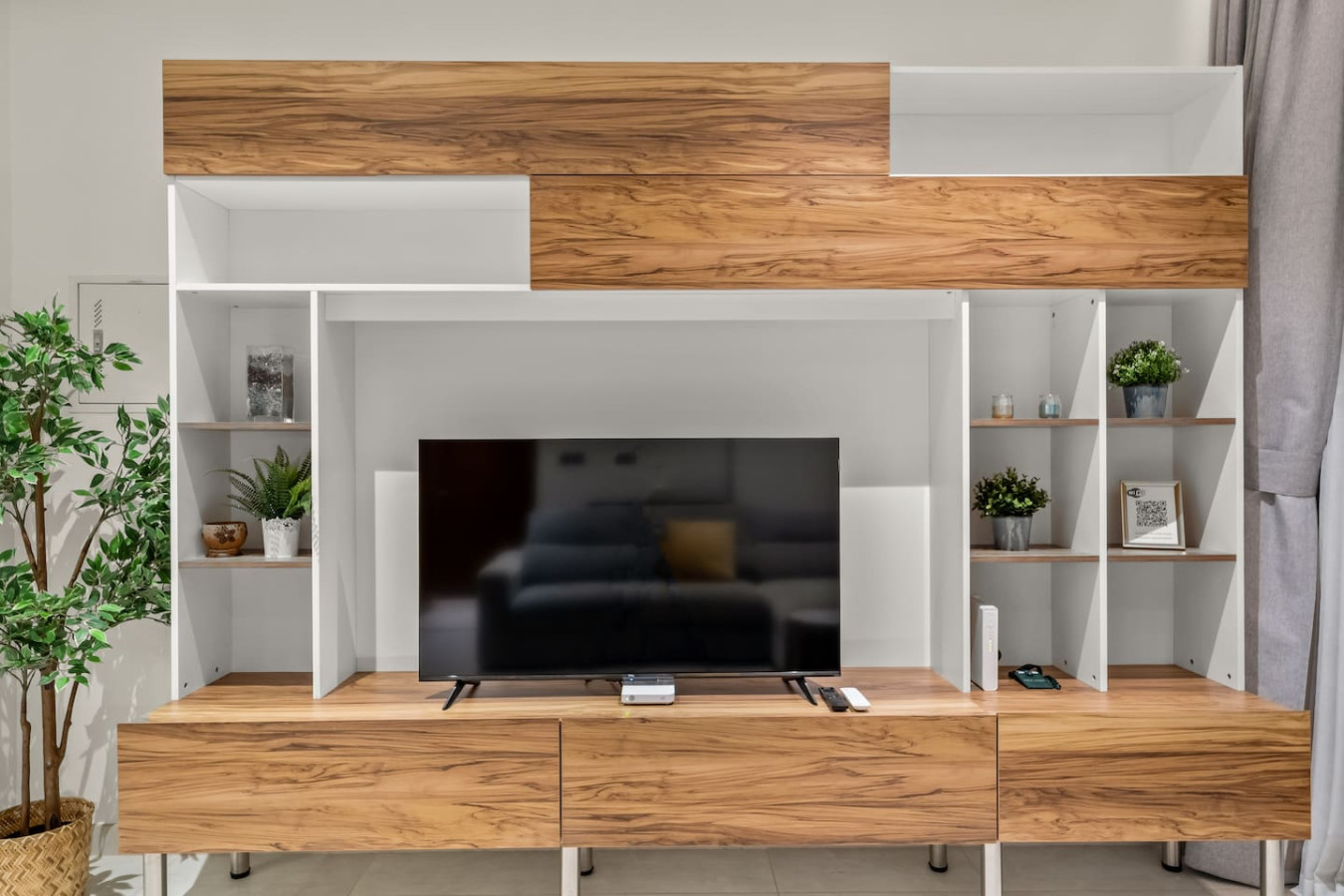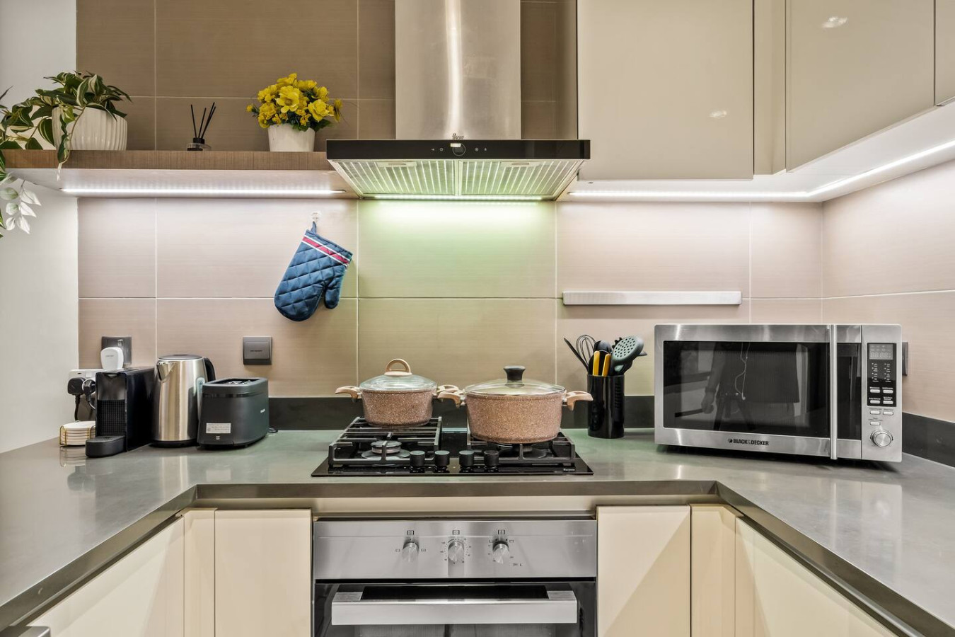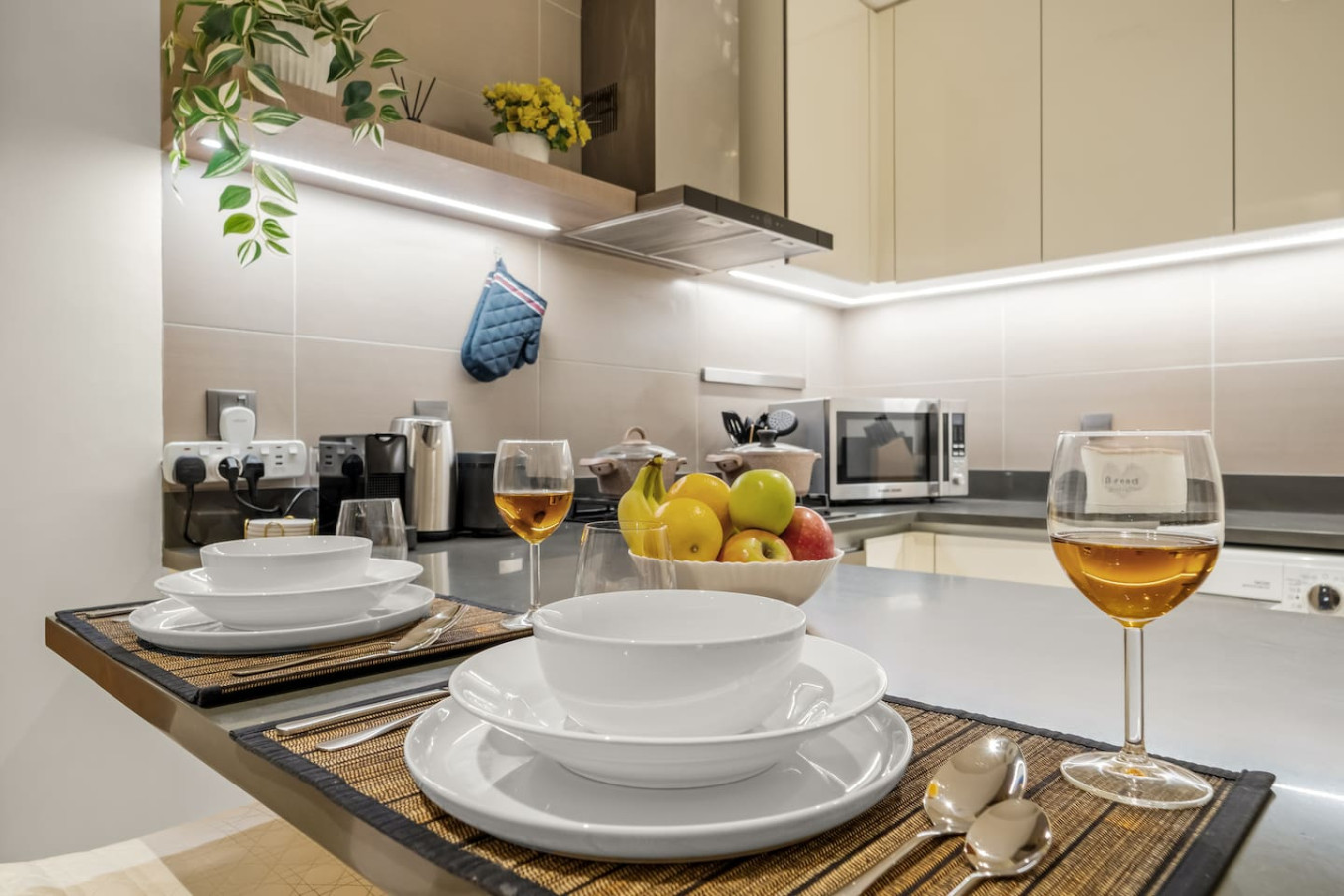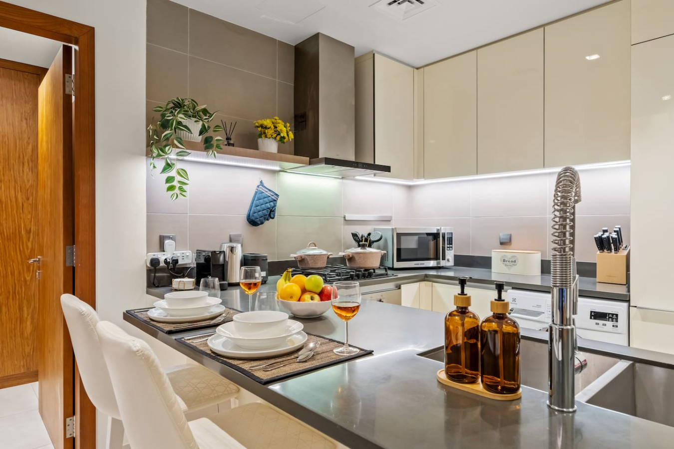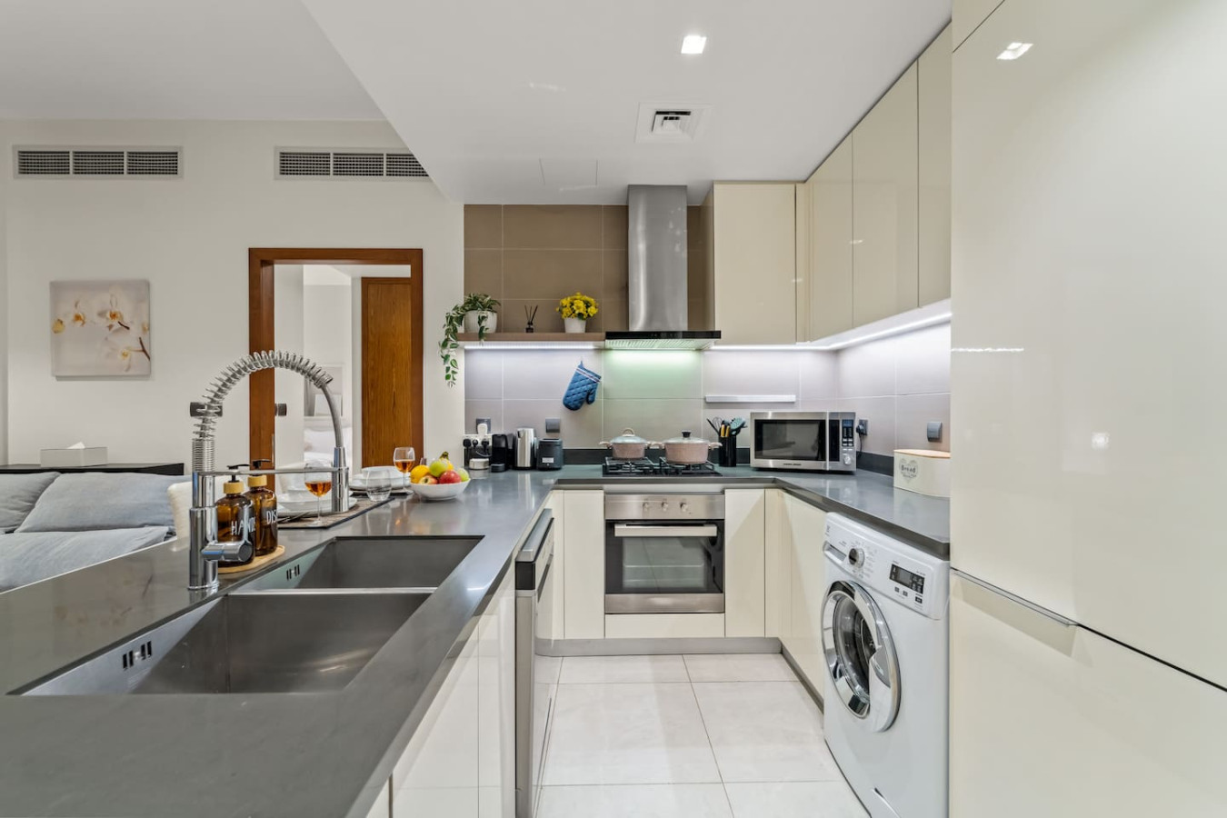 It is fully equipped with stainless-steel cooking appliances that make it suitable for preparing any meal, whether a simple breakfast, quick snack or a three-course gourmet dinner. Spacious quartz countertops and a central kitchen island provide plenty of room to work your MasterChef magic.