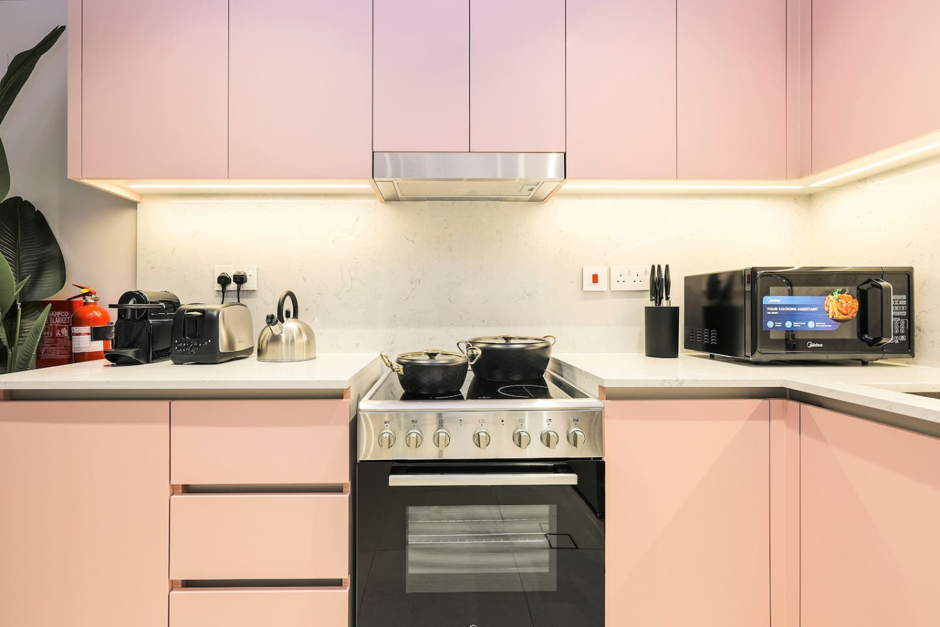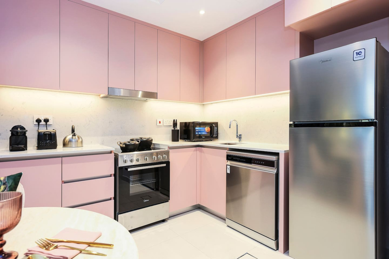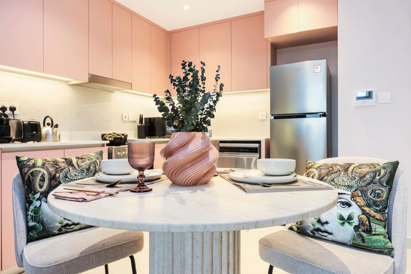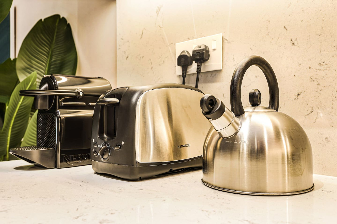 It is fully equipped with stainless-steel cooking appliances that make it suitable for preparing any meal, whether a simple breakfast, quick snack or a three-course gourmet dinner. Spacious quartz countertops and a central kitchen island provide plenty of room to work your MasterChef magic.