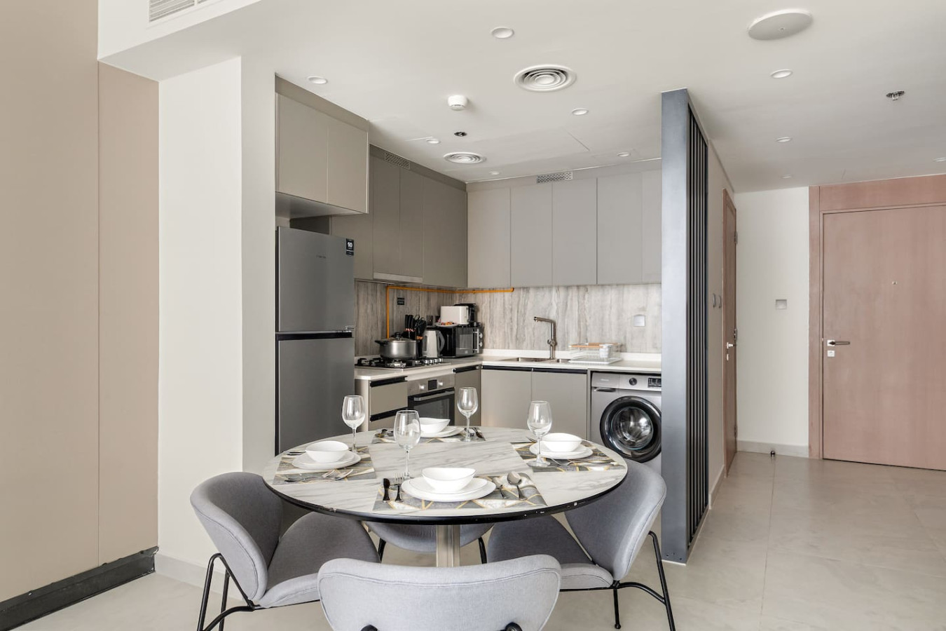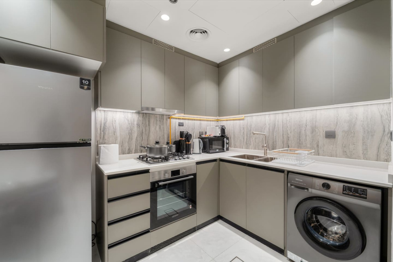 It is fully equipped with stainless-steel cooking appliances that make it suitable for preparing any meal, whether a simple breakfast, quick snack or a three-course gourmet dinner. Spacious quartz countertops and a central kitchen island provide plenty of room to work your MasterChef magic.
