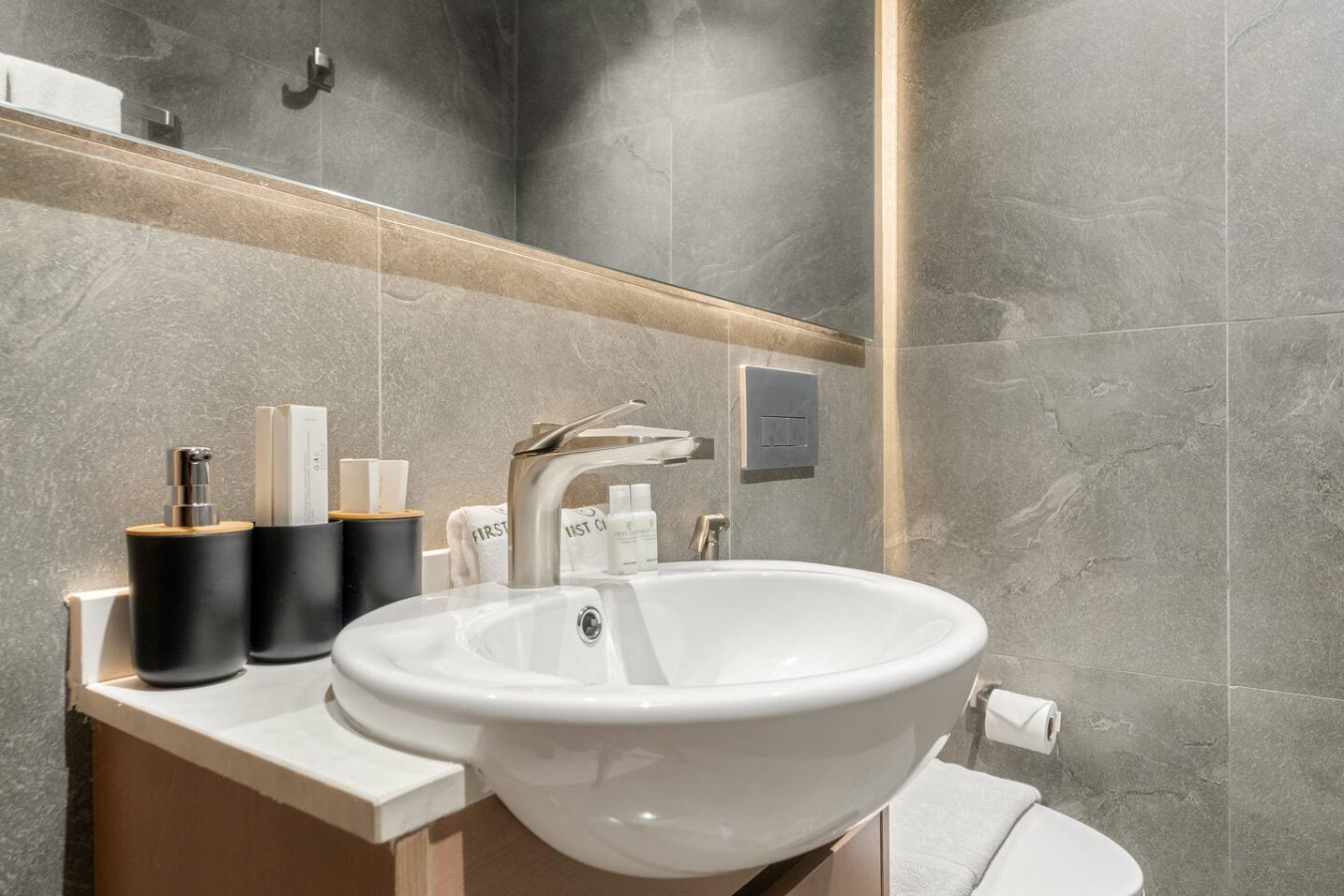 The bathroom is stocked with fresh towels and essential toiletries, so you don’t have to worry about bringing your own.