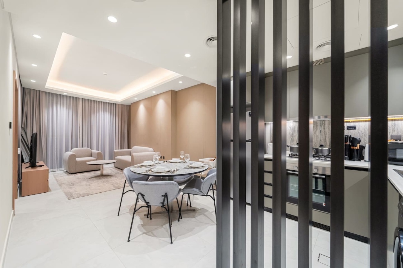 Have a few drinks in the living room while the food is getting ready. Once it’s done, serve it at the inviting dining table and enjoy a tasty meal with your loved ones.