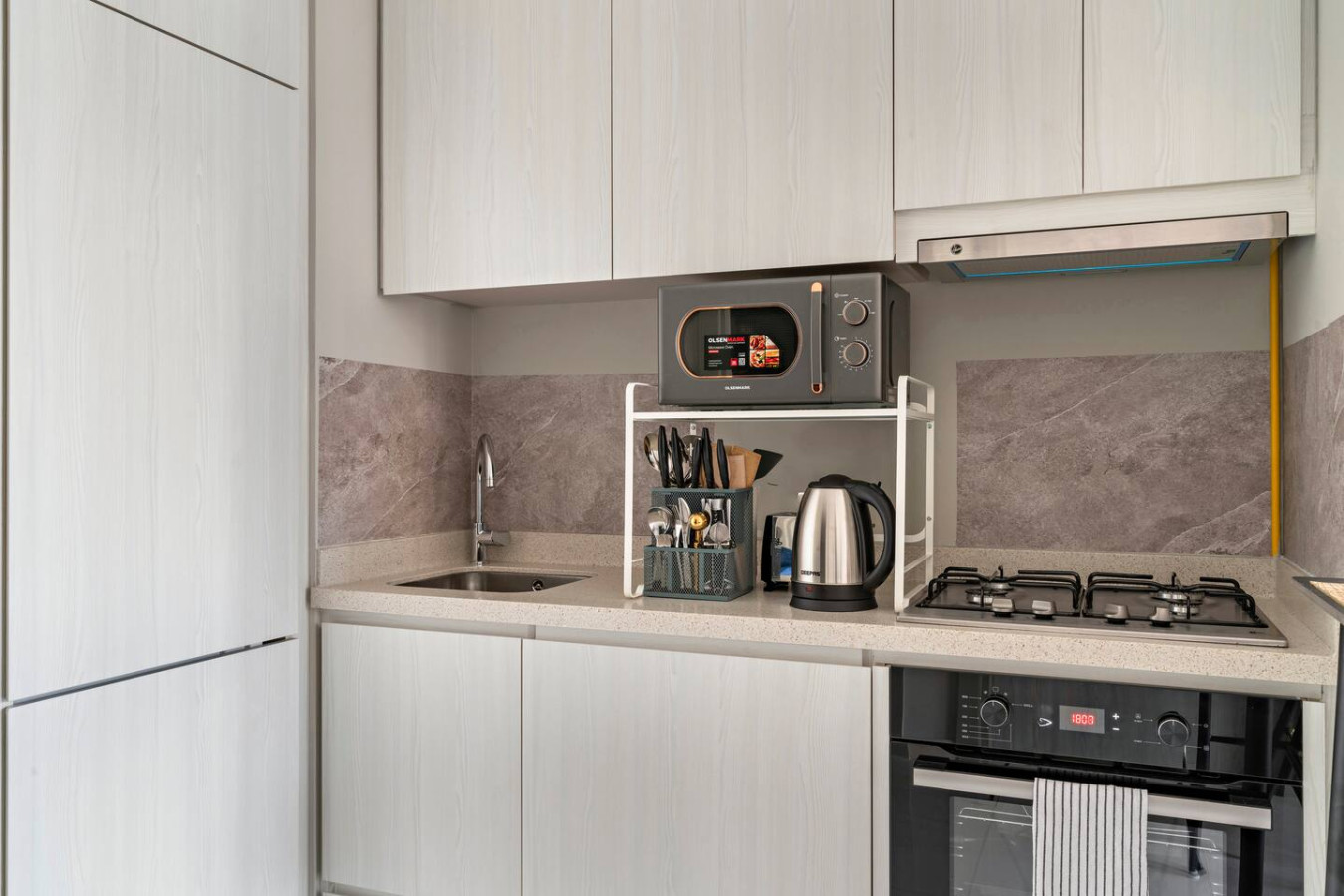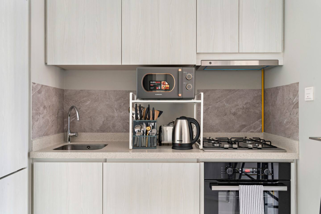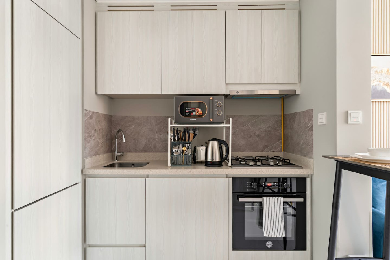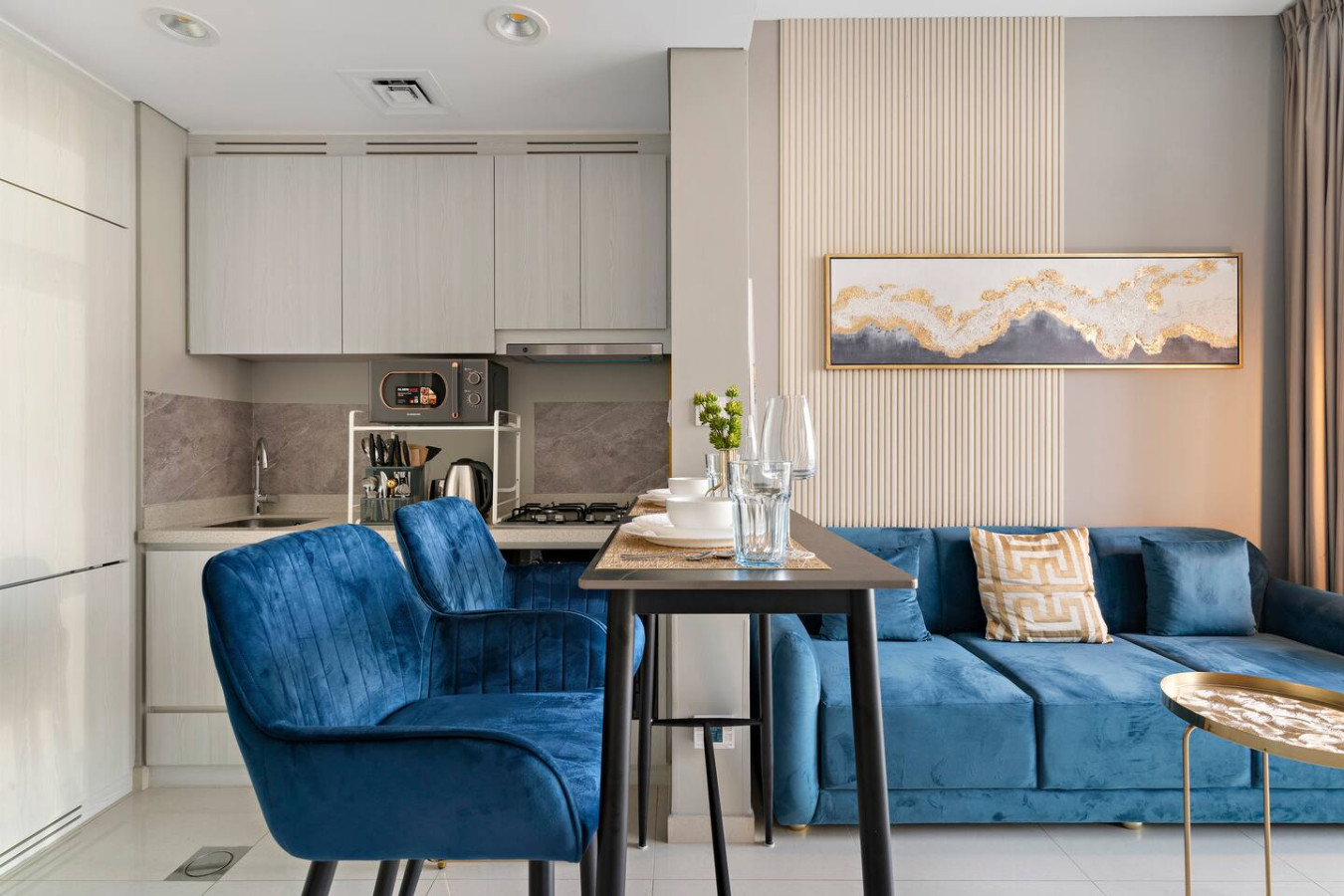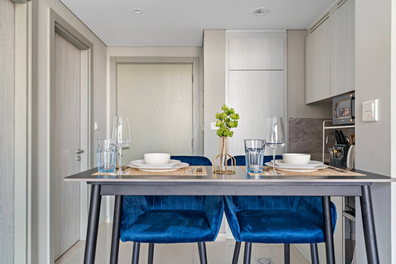 It is fully equipped with stainless-steel cooking appliances that make it suitable for preparing any meal, whether a simple breakfast, quick snack or a three-course gourmet dinner. Spacious quartz countertops and a central kitchen island provide plenty of room to work your MasterChef magic.