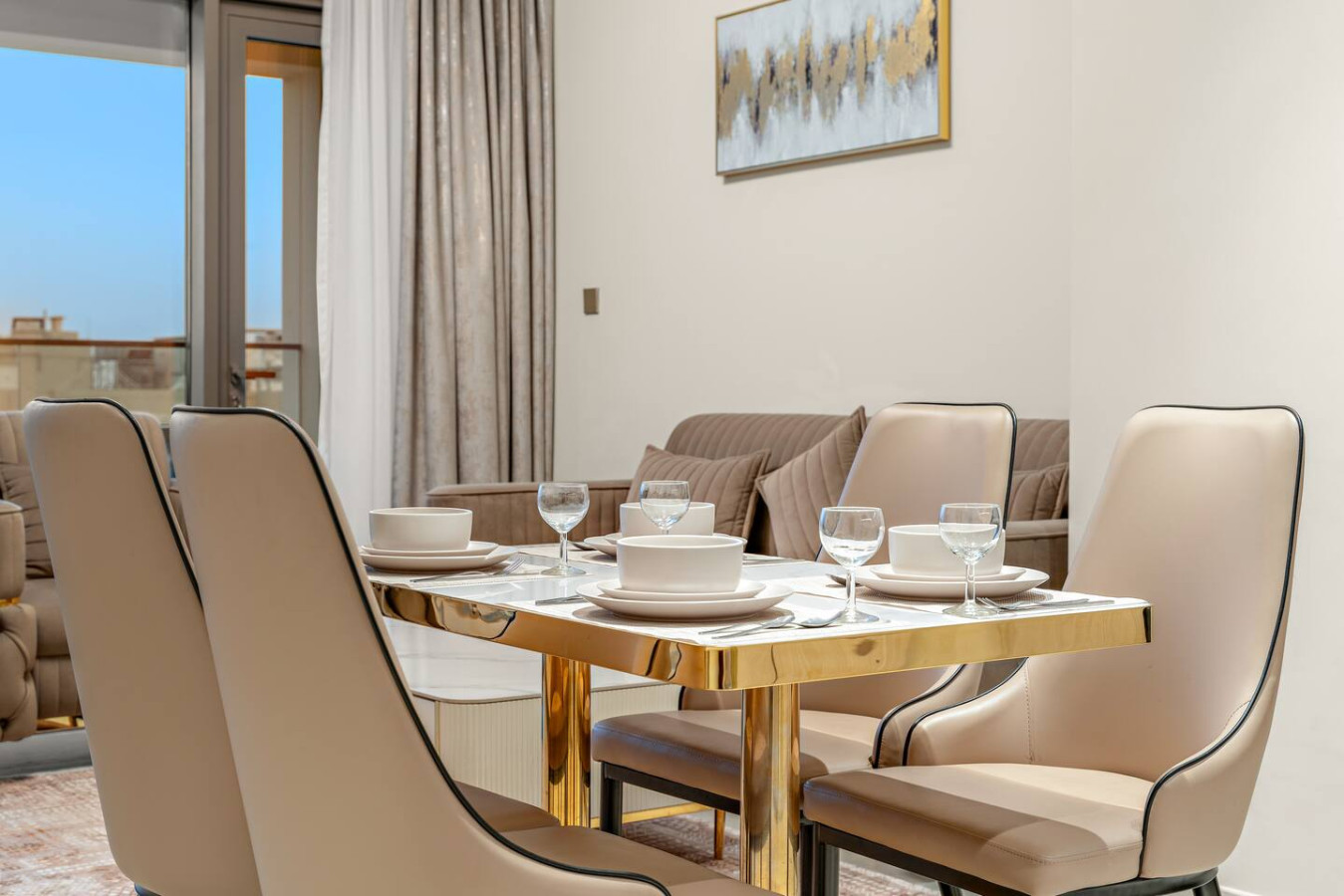 Have a few drinks in the living room while the food is getting ready. Once it’s done, serve it at the inviting dining table and enjoy a tasty meal with your loved ones.