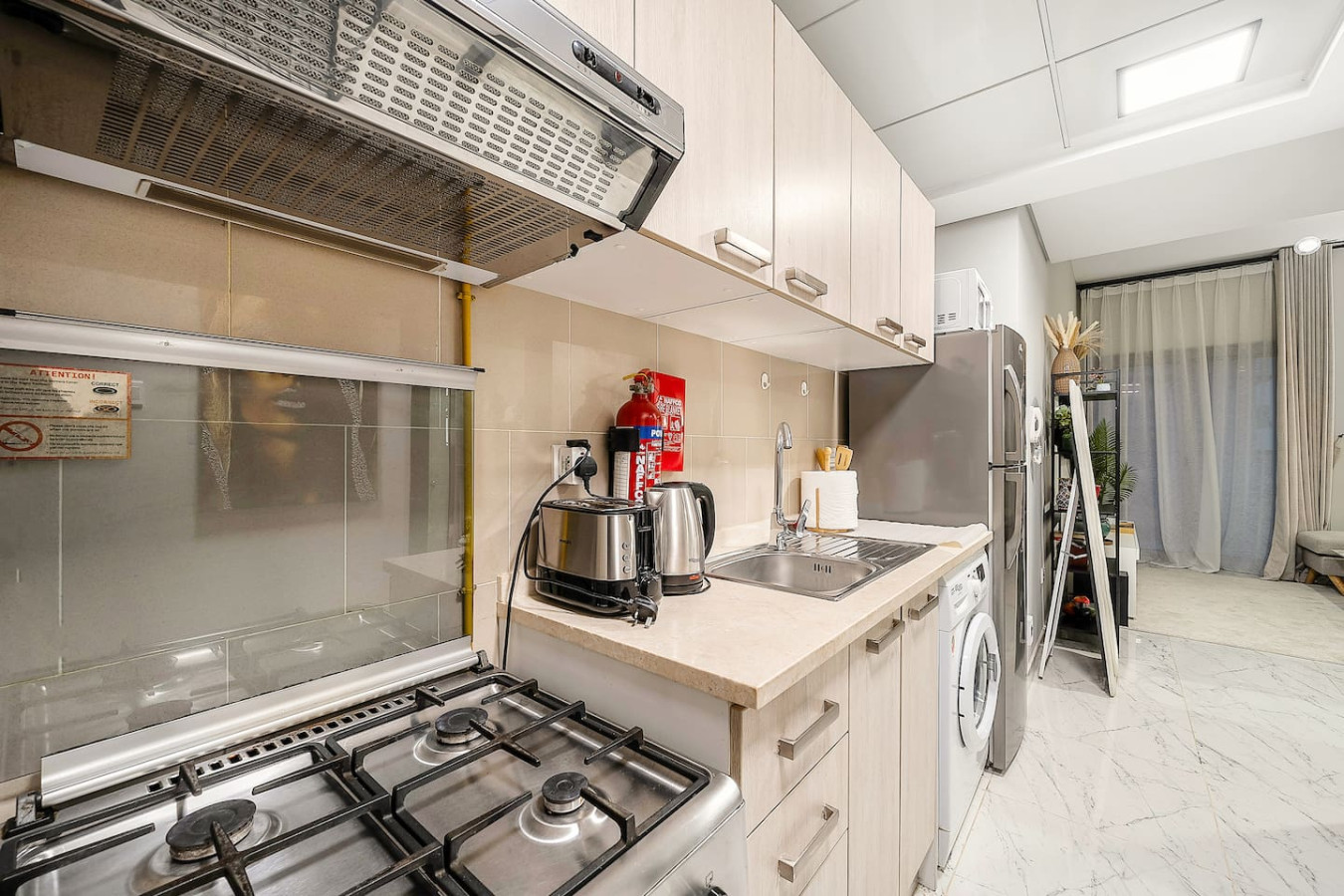 It is fully equipped with stainless-steel cooking appliances that make it suitable for preparing any meal, whether a simple breakfast, quick snack or a three-course gourmet dinner. Spacious quartz countertops and a central kitchen island provide plenty of room to work your MasterChef magic.