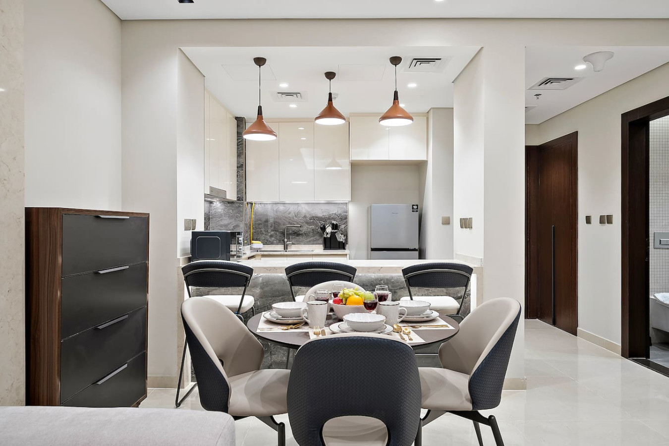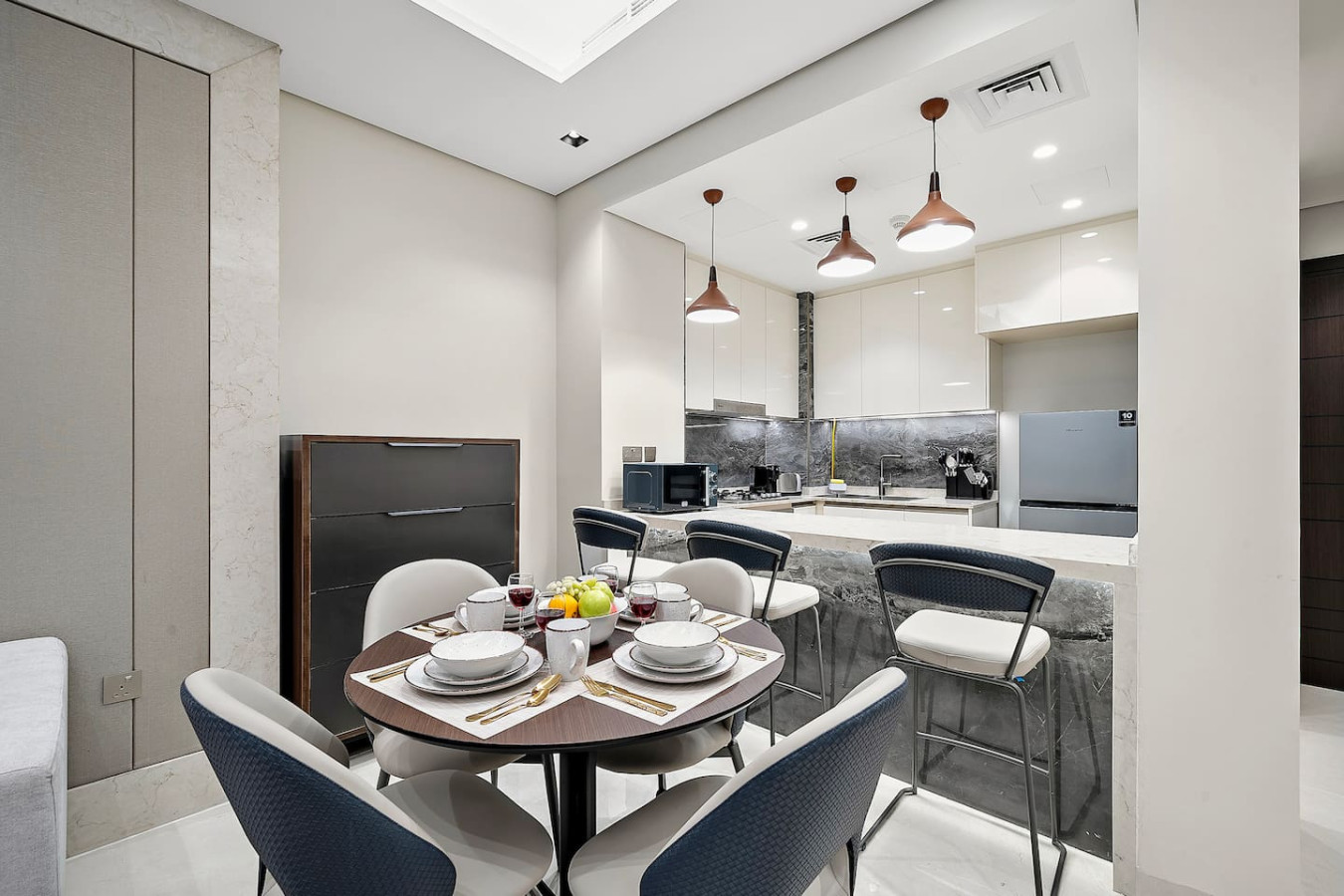 Have a few drinks in the living room while the food is getting ready. Once it’s done, serve it at the inviting dining table and enjoy a tasty meal with your loved ones.
