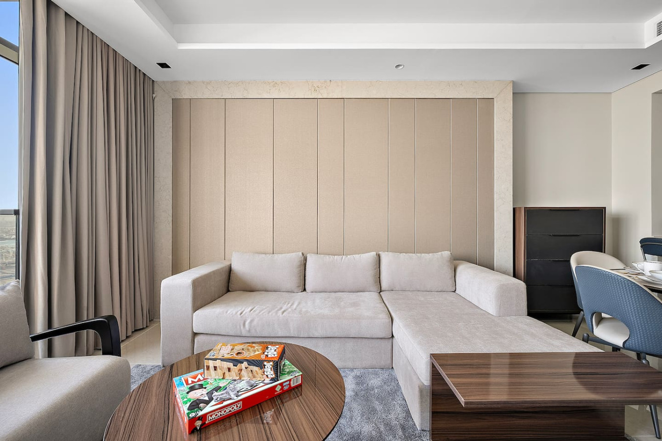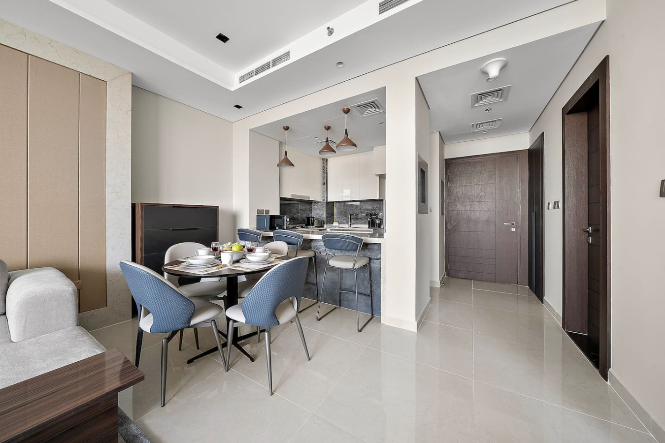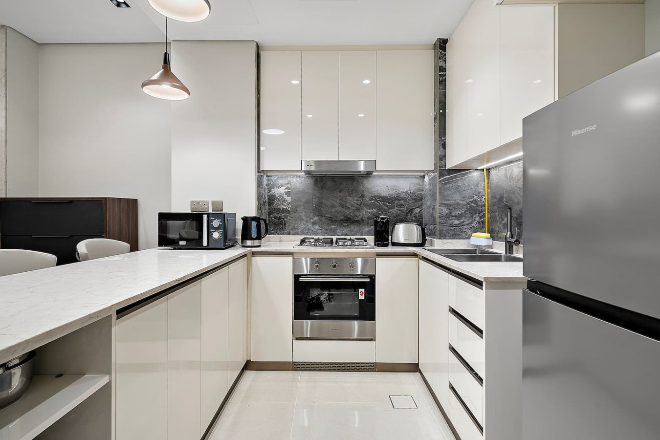 It is fully equipped with stainless-steel cooking appliances that make it suitable for preparing any meal, whether a simple breakfast, quick snack or a three-course gourmet dinner. Spacious quartz countertops and a central kitchen island provide plenty of room to work your MasterChef magic.