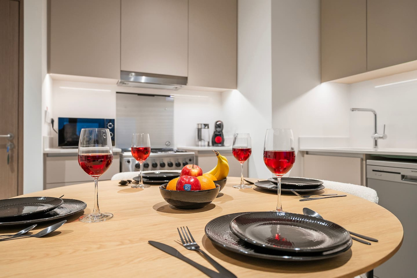 Have a few drinks in the living room while the food is getting ready. Once it’s done, serve it at the inviting dining table and enjoy a tasty meal with your loved ones.