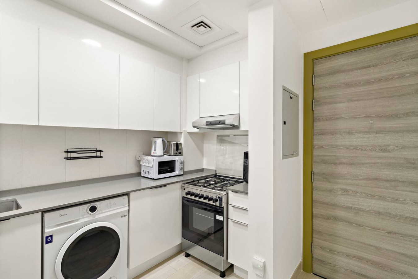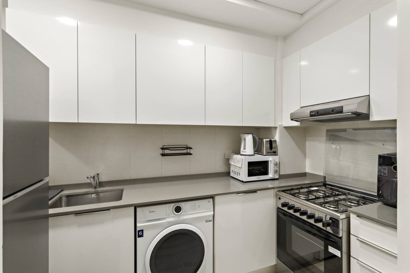 It is fully equipped with stainless-steel cooking appliances that make it suitable for preparing any meal, whether a simple breakfast, quick snack or a three-course gourmet dinner. Spacious quartz countertops and a central kitchen island provide plenty of room to work your MasterChef magic.