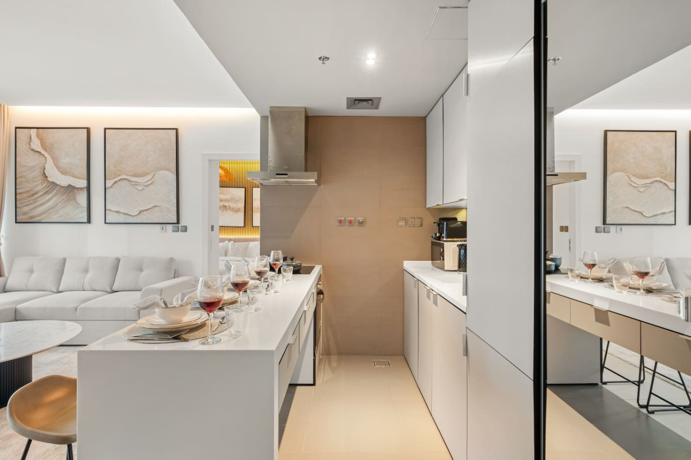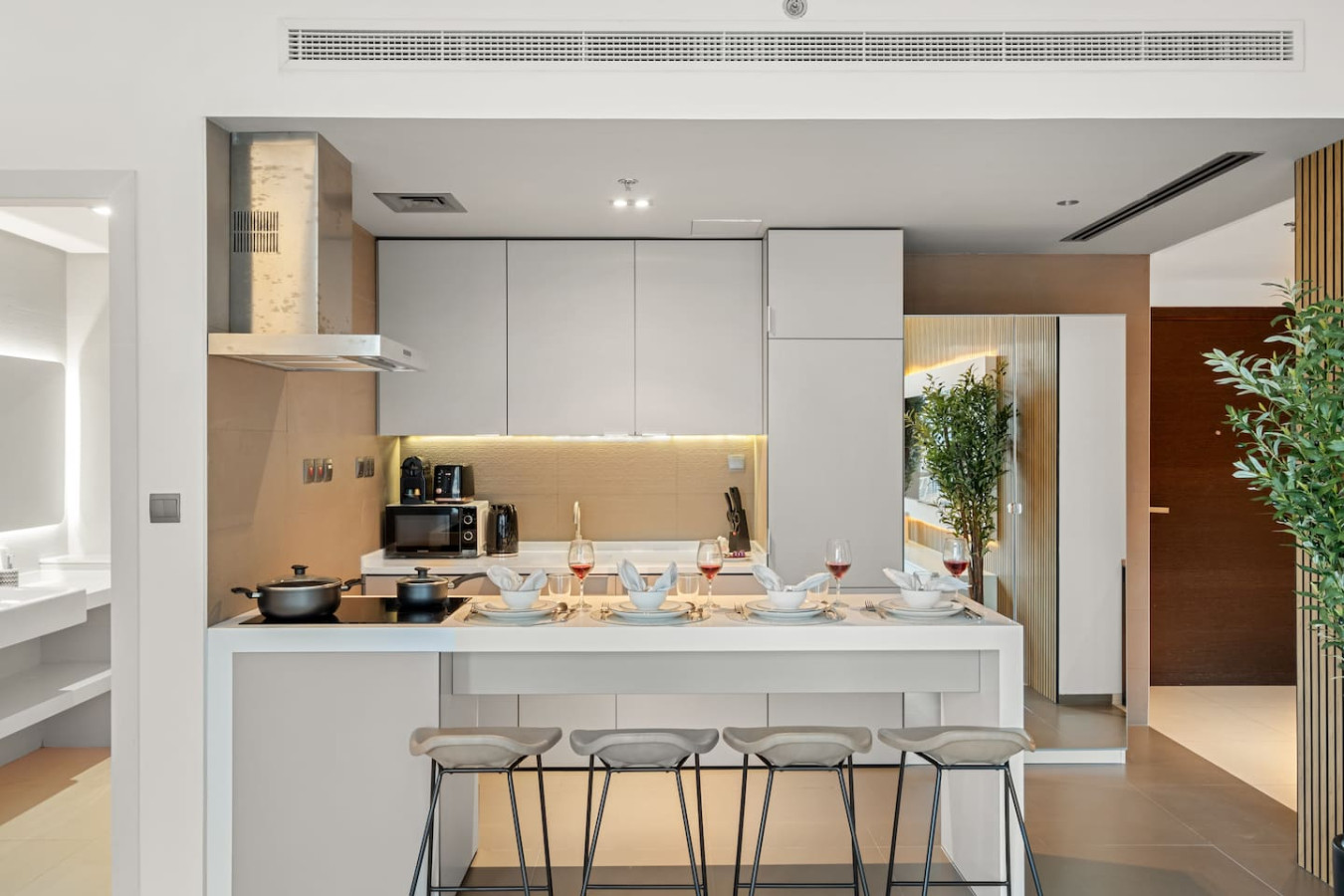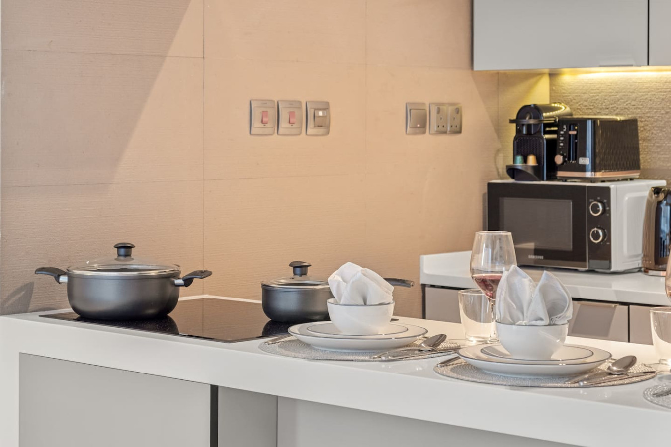 It is fully equipped with stainless-steel cooking appliances that make it suitable for preparing any meal, whether a simple breakfast, quick snack or a three-course gourmet dinner. Spacious quartz countertops and a central kitchen island provide plenty of room to work your MasterChef magic.