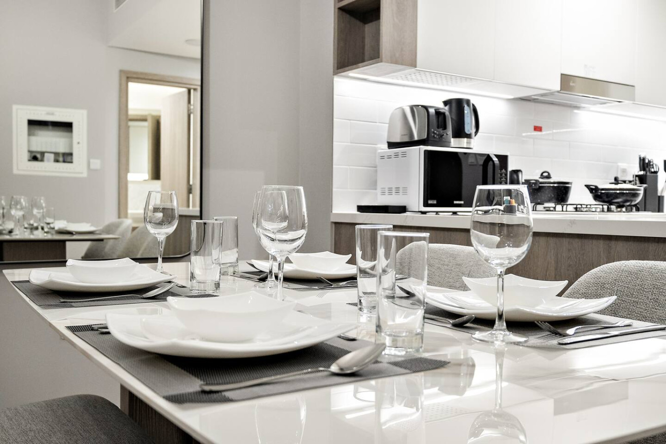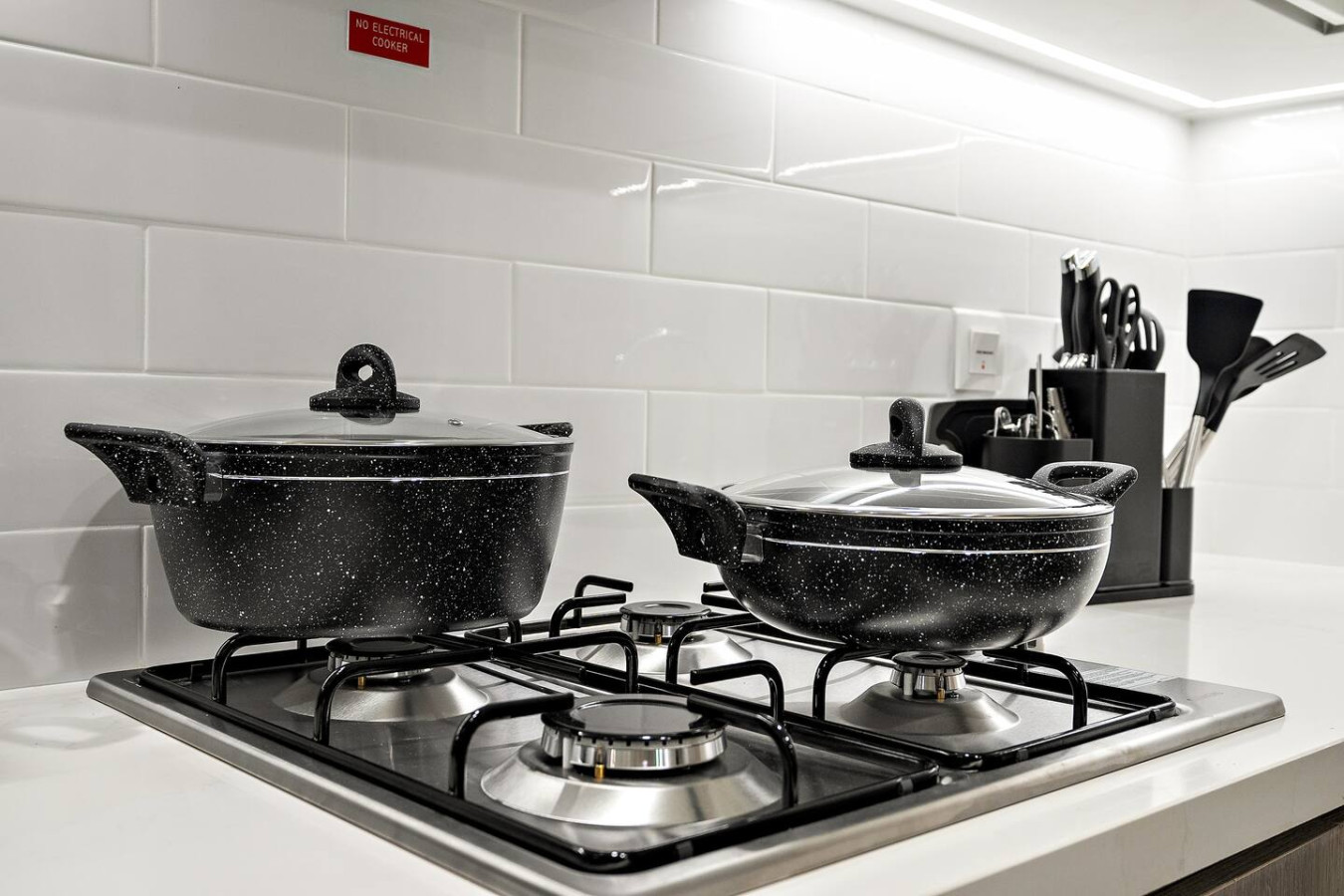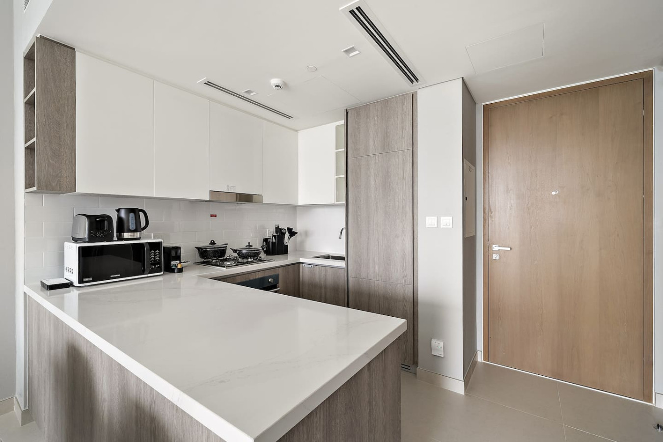 It is fully equipped with stainless-steel cooking appliances that make it suitable for preparing any meal, whether a simple breakfast, quick snack or a three-course gourmet dinner. Spacious quartz countertops and a central kitchen island provide plenty of room to work your MasterChef magic.
