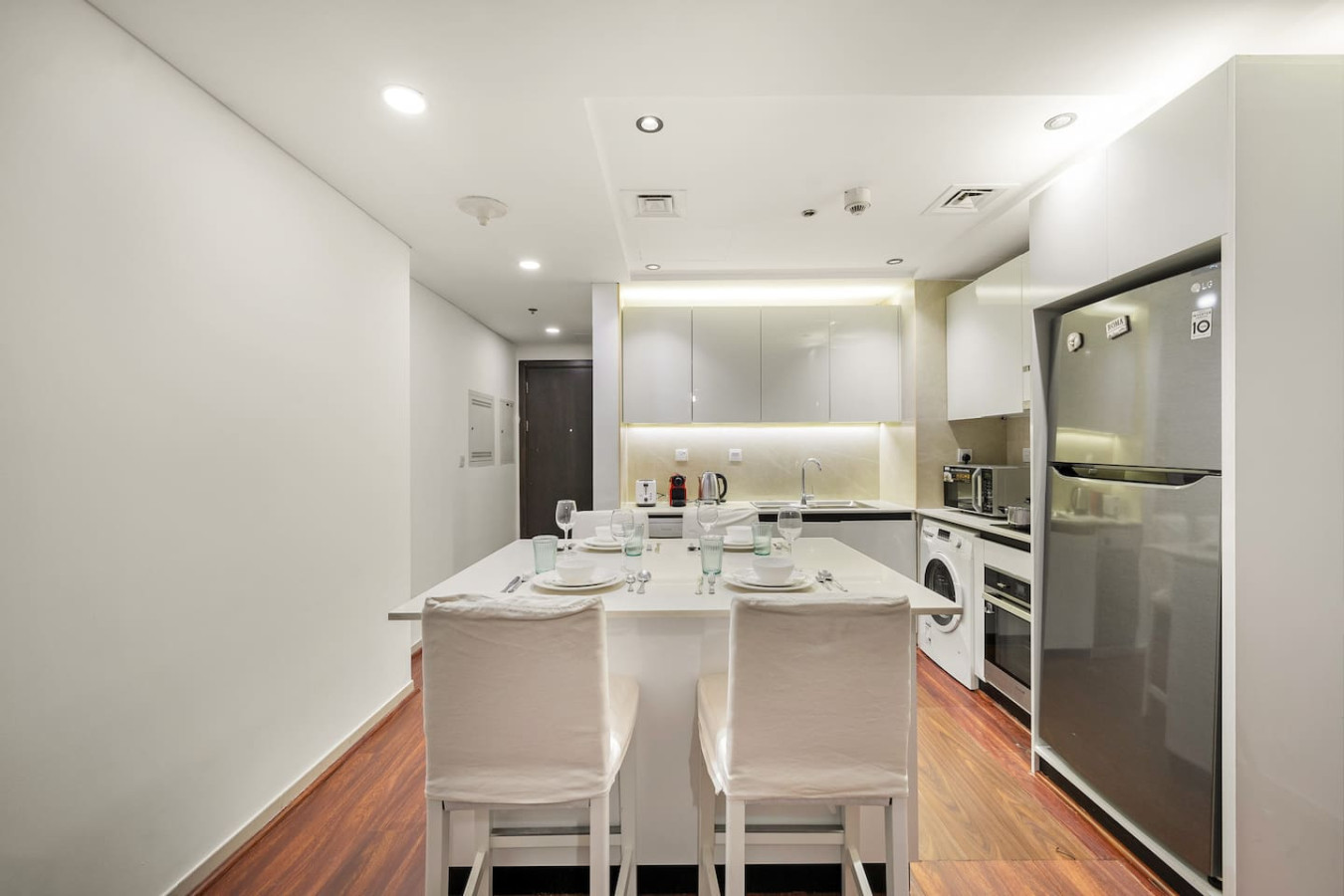 It is fully equipped with stainless-steel cooking appliances that make it suitable for preparing any meal, whether a simple breakfast, a quick snack, or a three-course gourmet dinner. Spacious quartz countertops and a central kitchen island provide plenty of room to work your MasterChef magic.
