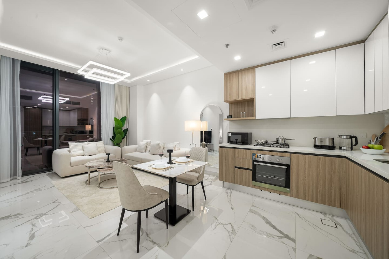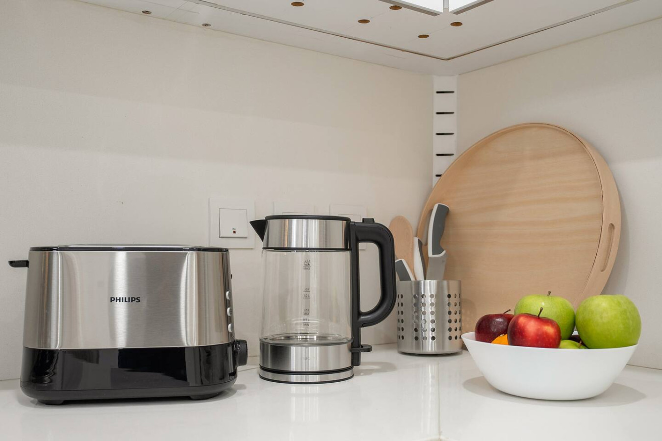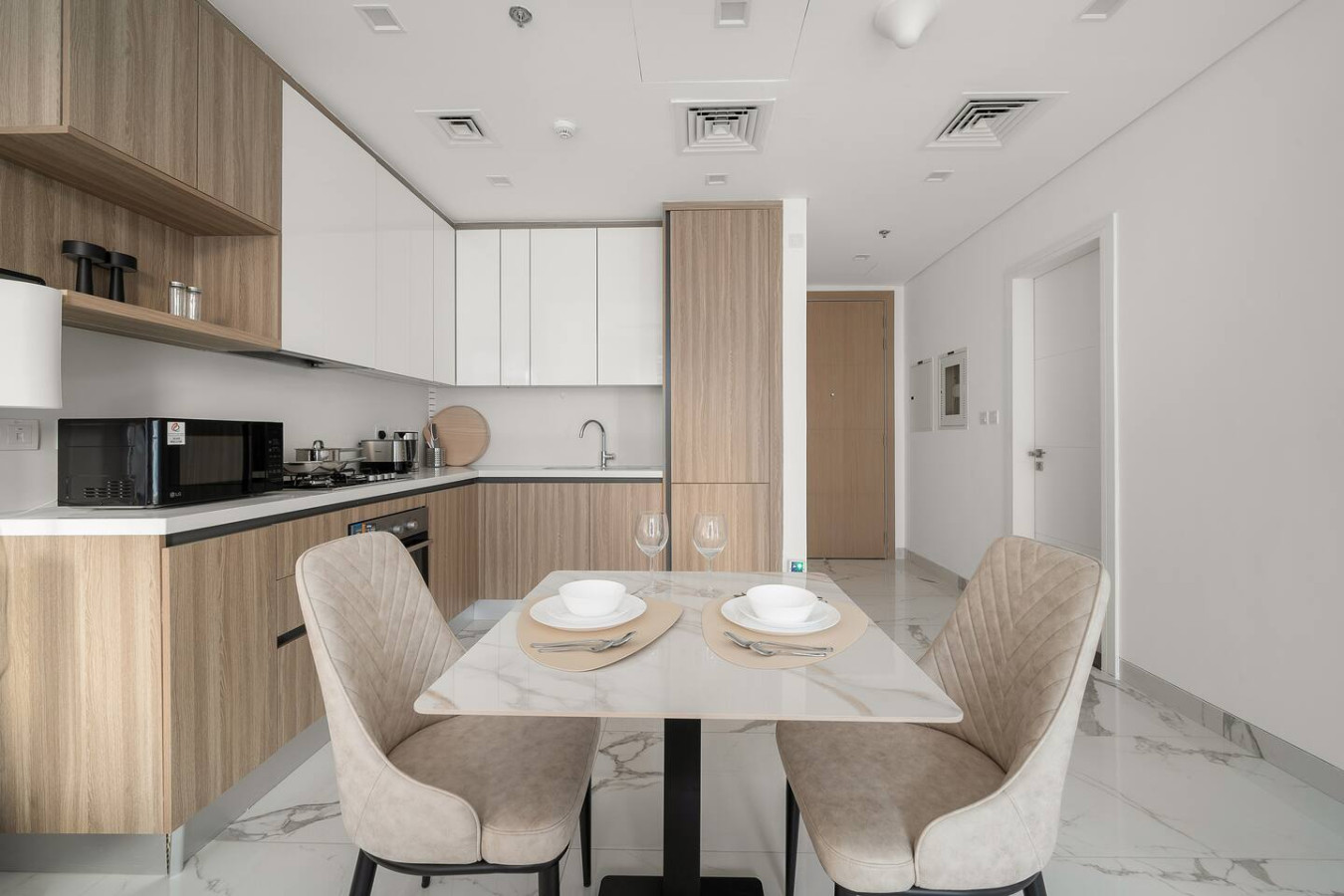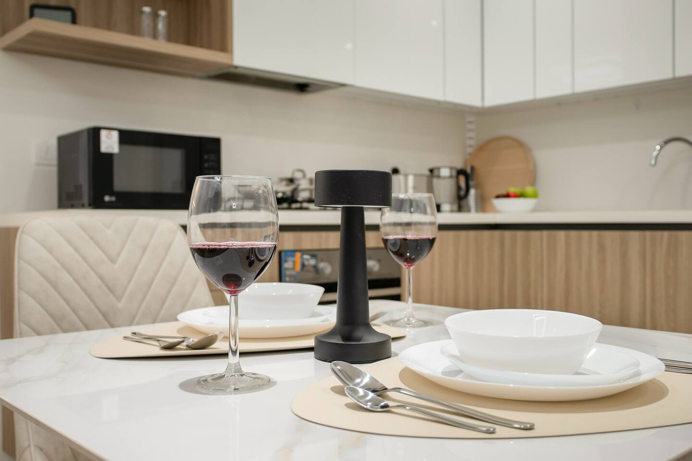 It is fully equipped with stainless-steel cooking appliances that make it suitable for preparing any meal, whether a simple breakfast, quick snack or a three-course gourmet dinner. Spacious quartz countertops and a central kitchen island provide plenty of room to work your MasterChef magic.