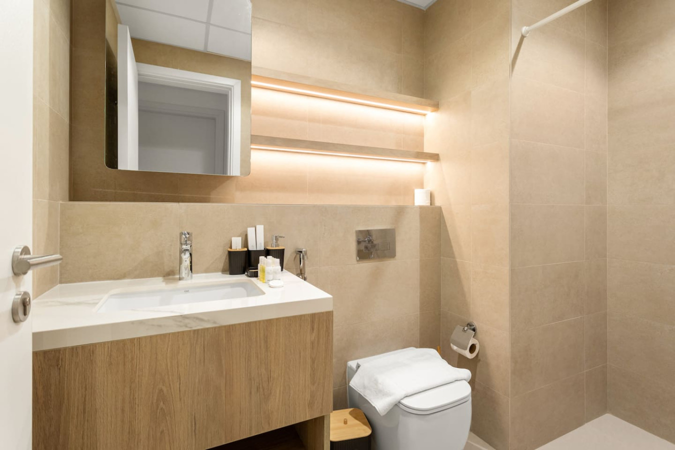 The bathroom is stocked with fresh towels and essential toiletries, so you don’t have to worry about bringing your own.