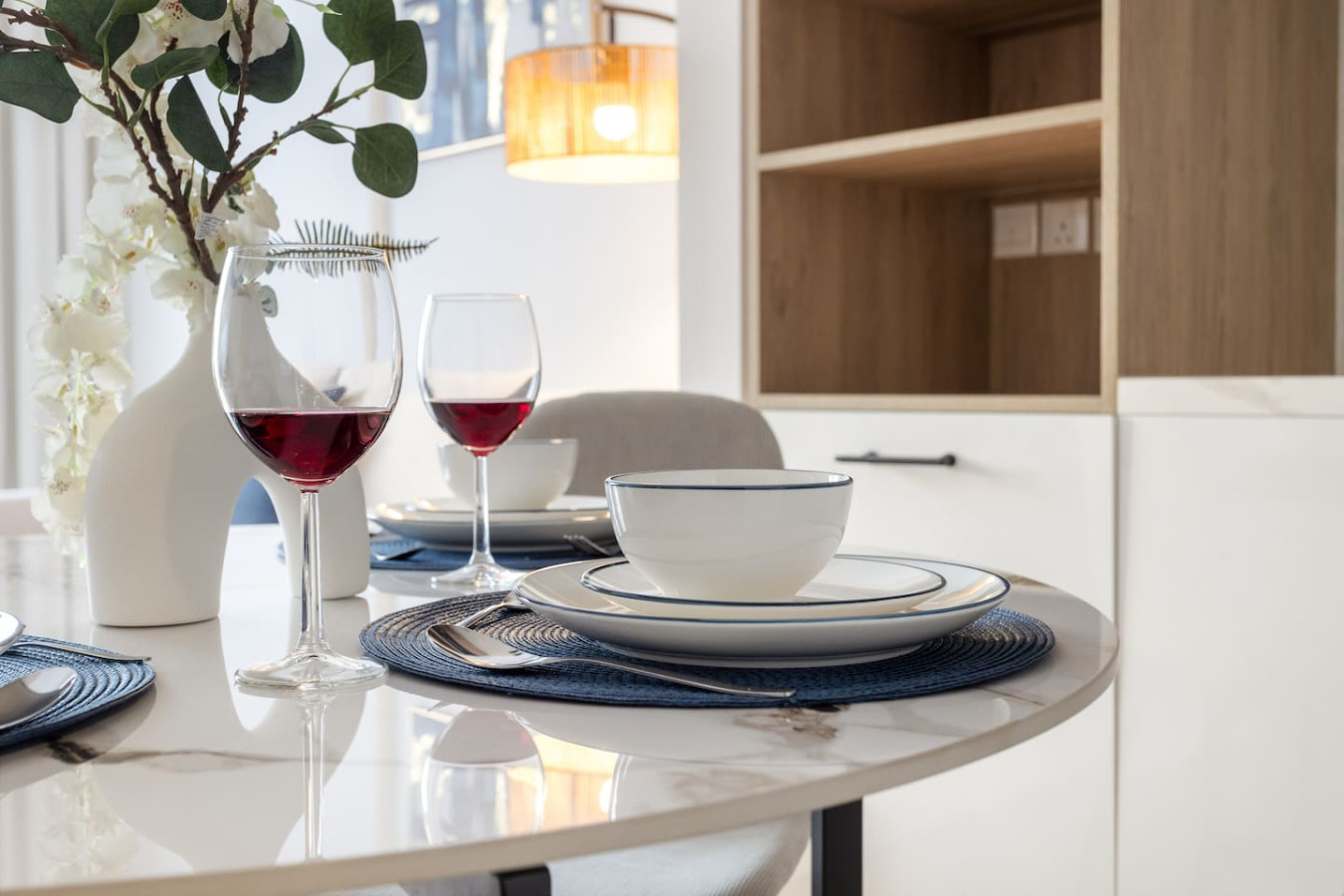 Have a few drinks in the living room while the food is getting ready. Once it’s done, serve it at the inviting dining table and enjoy a tasty meal with your loved ones.