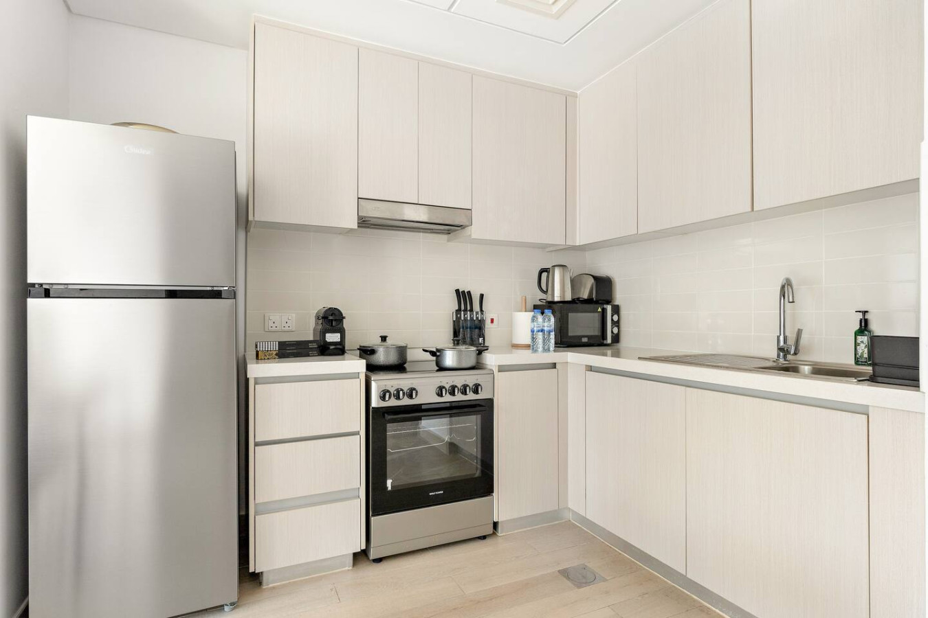 It is fully equipped with stainless-steel cooking appliances that make it suitable for preparing any meal, whether a simple breakfast, quick snack or a three-course gourmet dinner. Spacious quartz countertops and a central kitchen island provide plenty of room to work your MasterChef magic.