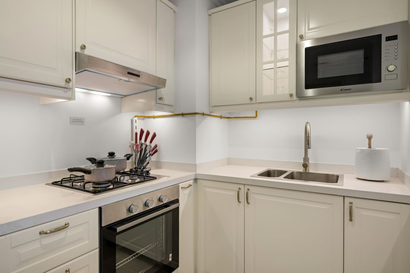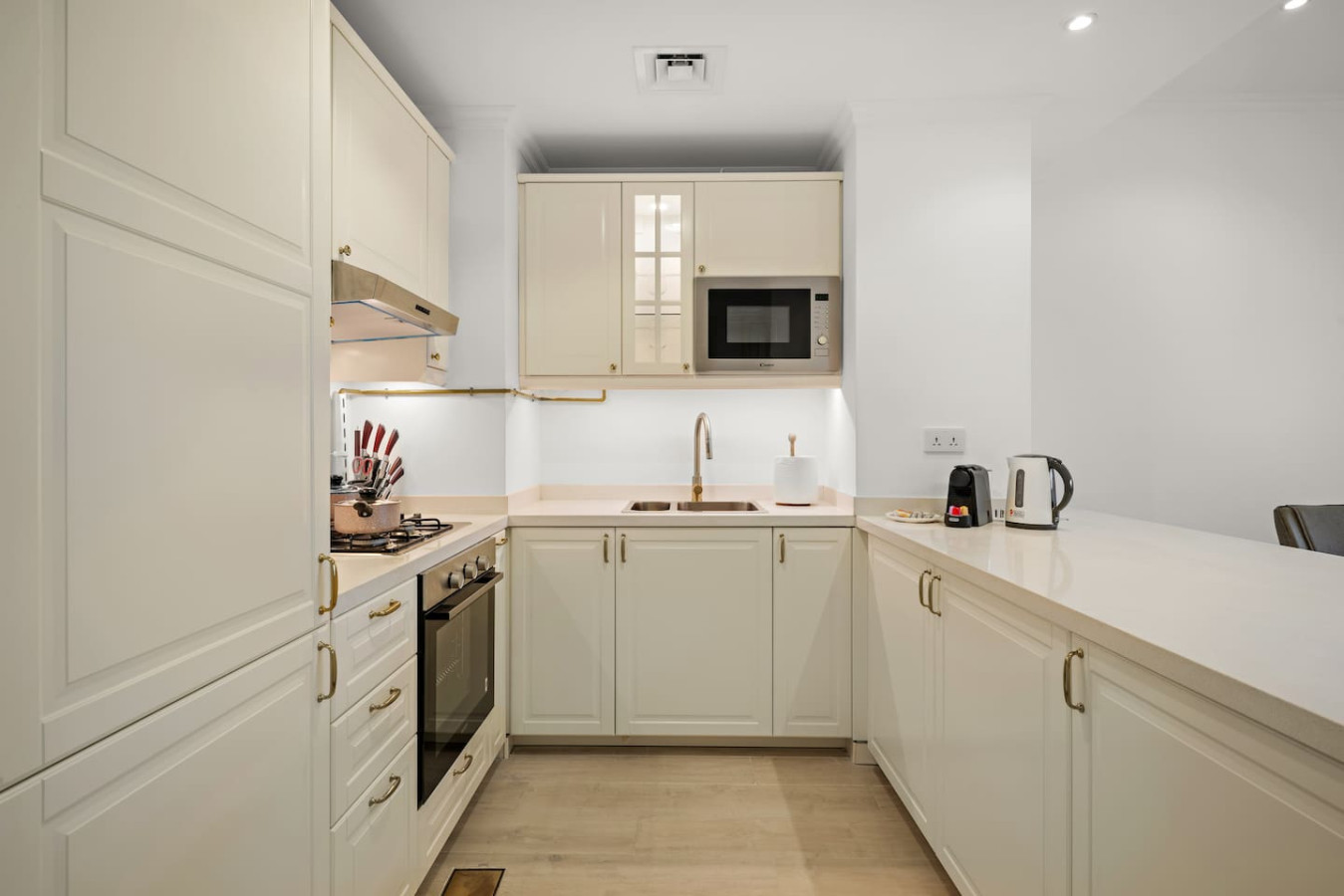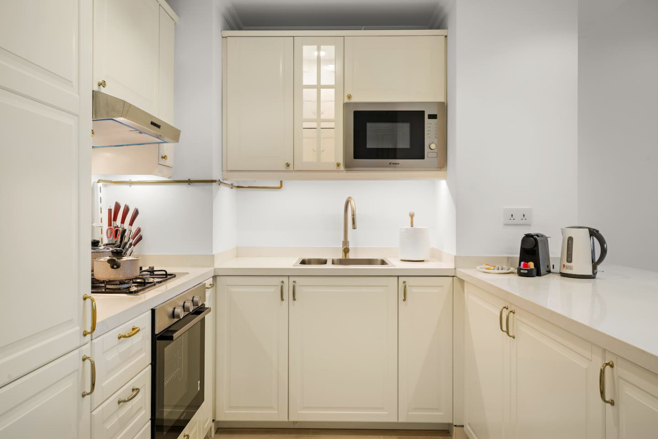 It is fully equipped with stainless-steel cooking appliances that make it suitable for preparing any meal, whether a simple breakfast, quick snack or a three-course gourmet dinner. Spacious quartz countertops and a central kitchen island provide plenty of room to work your MasterChef magic.