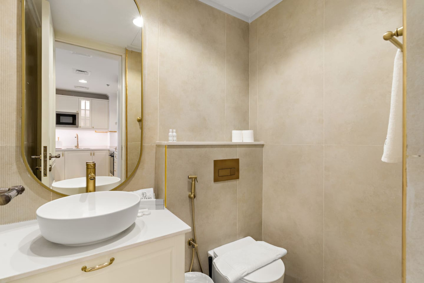 The bathroom is stocked with fresh towels and essential toiletries, so you don’t have to worry about bringing your own.