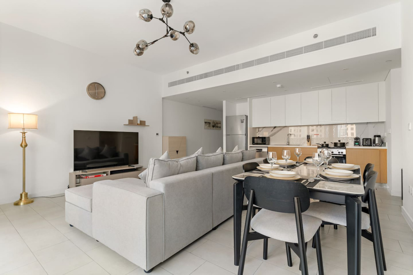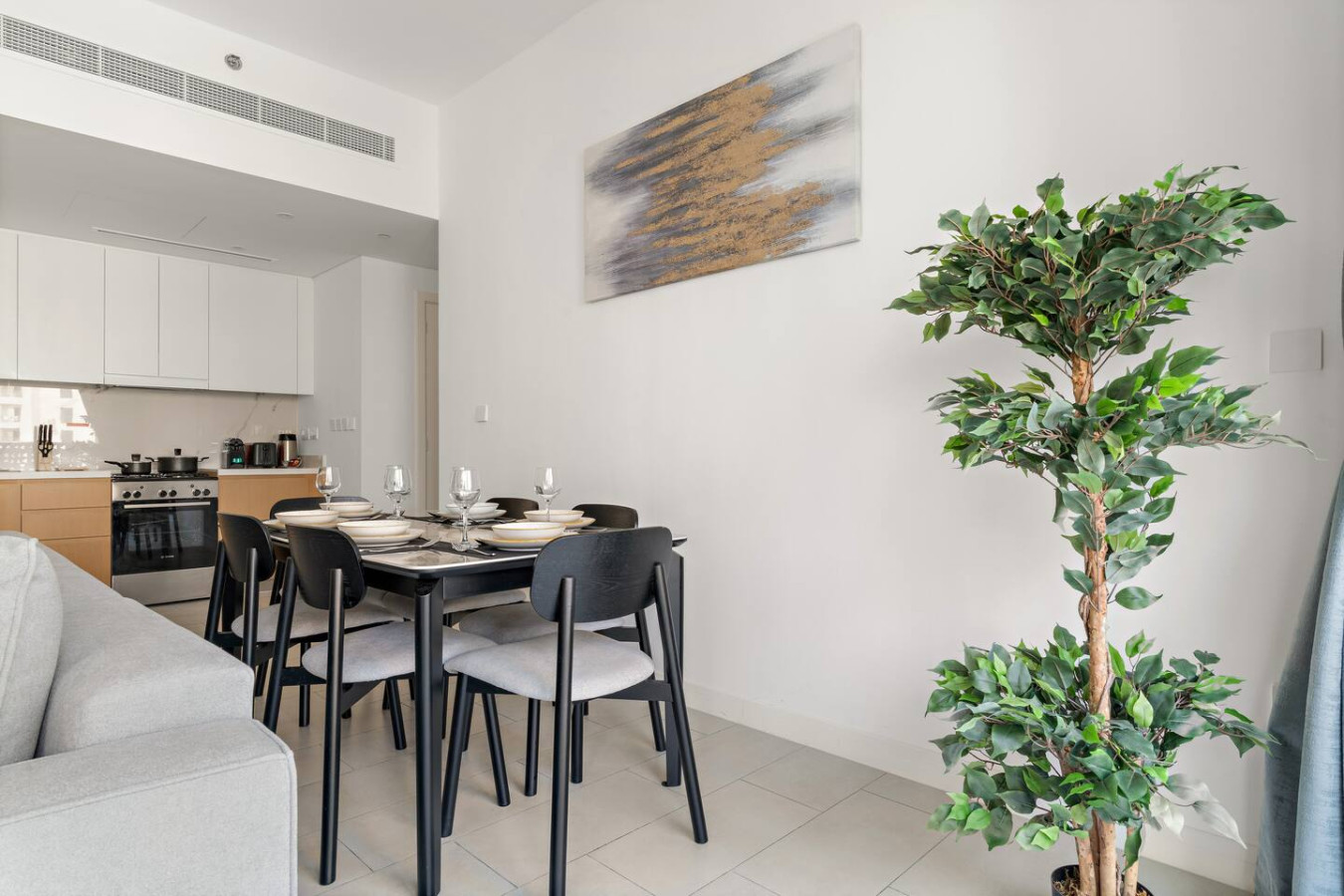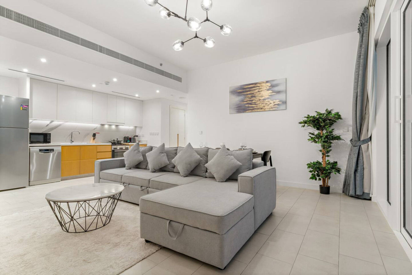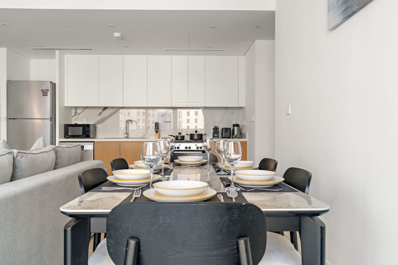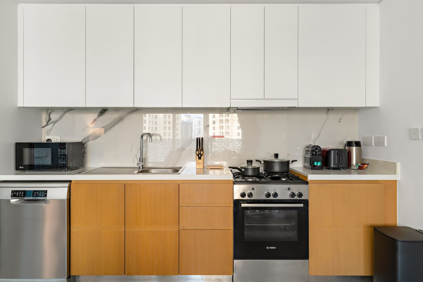 It is fully equipped with stainless-steel cooking appliances that make it suitable for preparing any meal, whether a simple breakfast, quick snack or a three-course gourmet dinner. Spacious quartz countertops and a central kitchen island provide plenty of room to work your MasterChef magic.