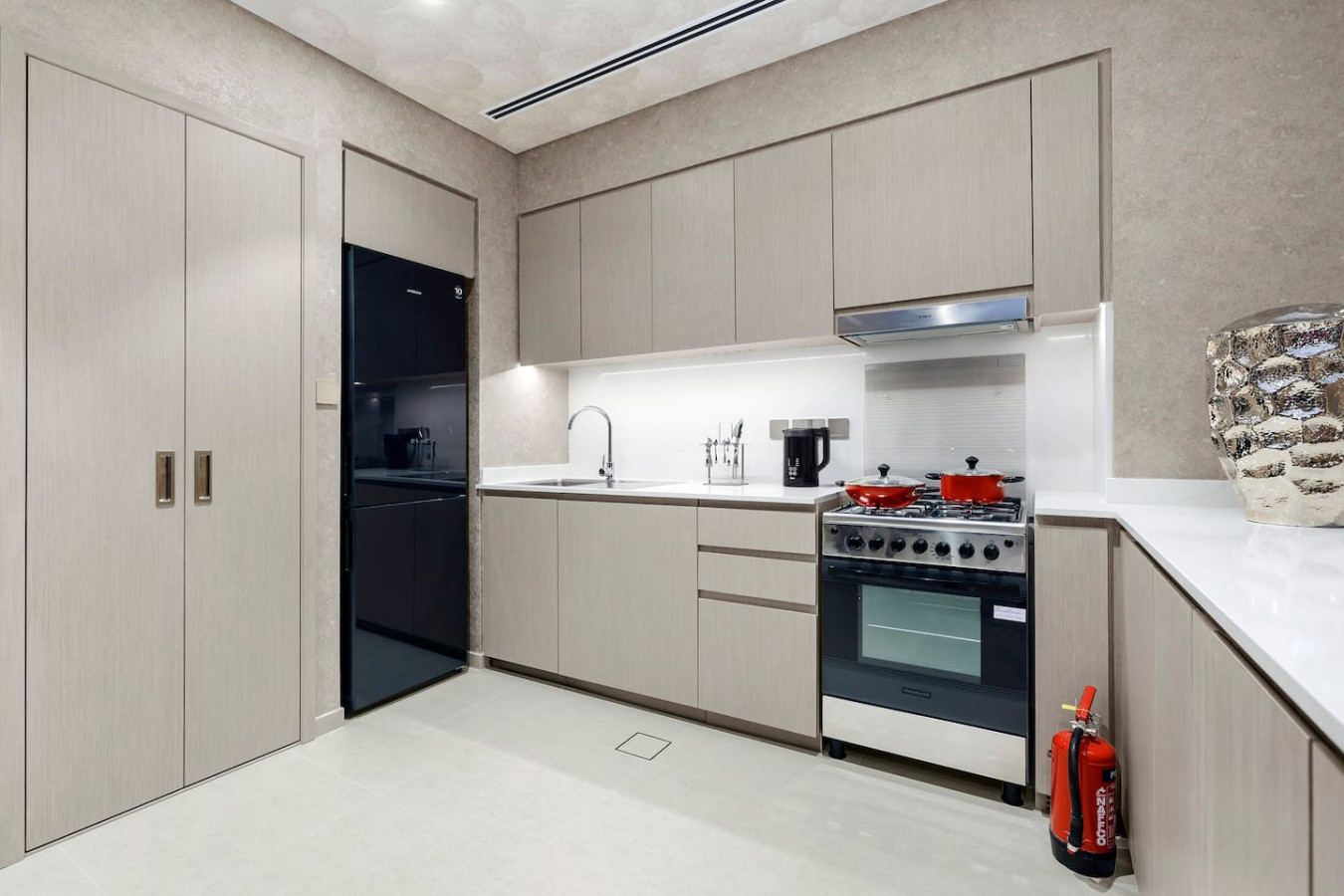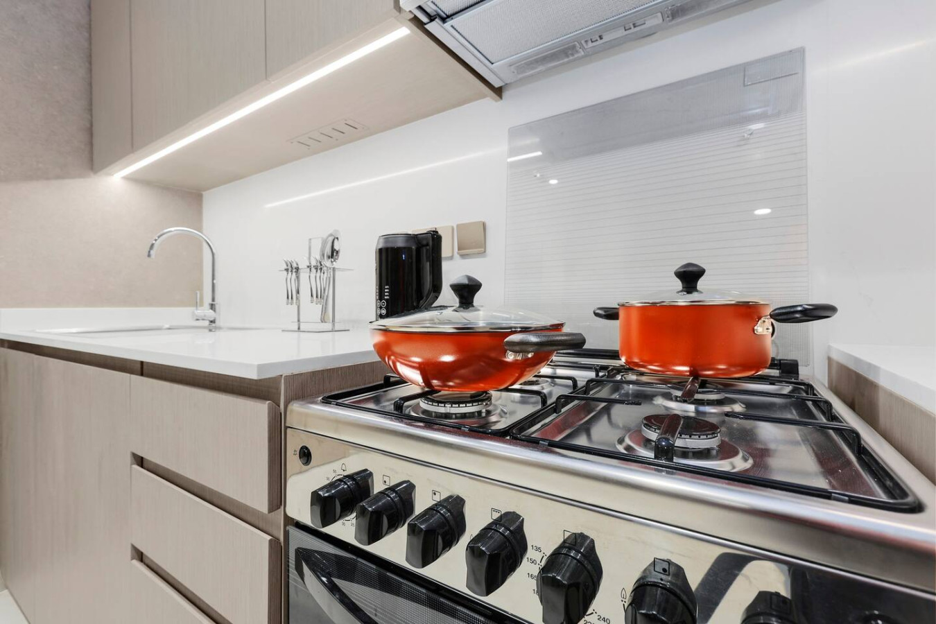 It is fully equipped with stainless-steel cooking appliances that make it suitable for preparing any meal, whether a simple breakfast, quick snack or a three-course gourmet dinner. Spacious quartz countertops and a central kitchen island provide plenty of room to work your MasterChef magic.
