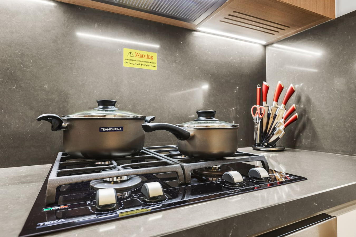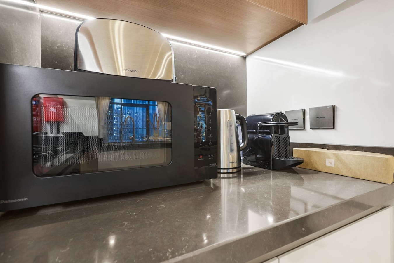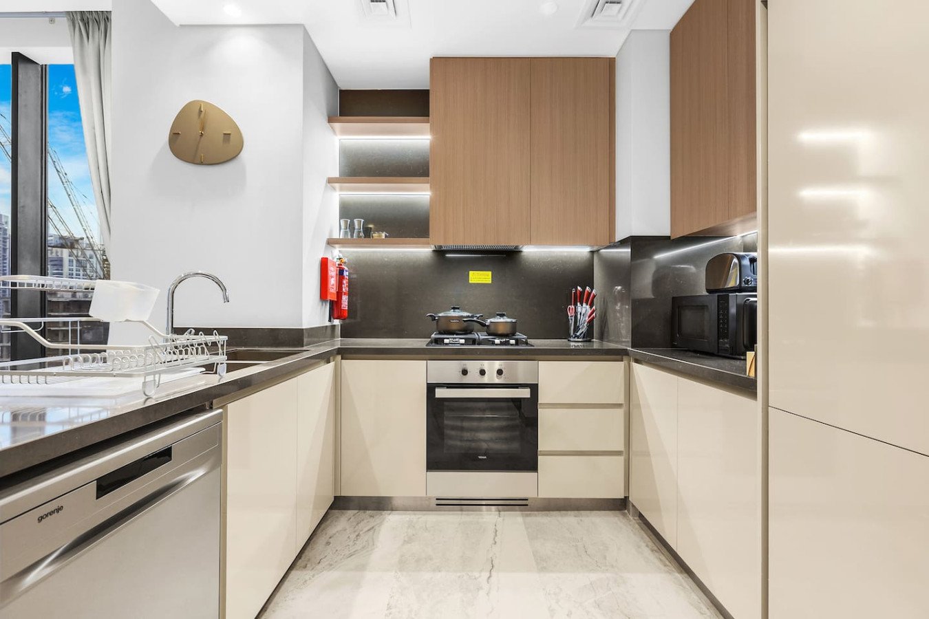 It is fully equipped with stainless-steel cooking appliances that make it suitable for preparing any meal, whether a simple breakfast, quick snack or a three-course gourmet dinner. Spacious quartz countertops and a central kitchen island provide plenty of room to work your MasterChef magic.
