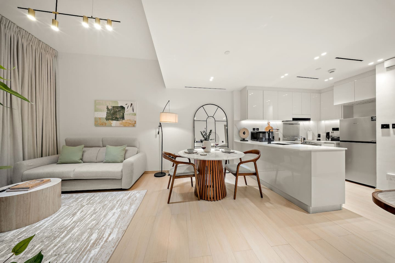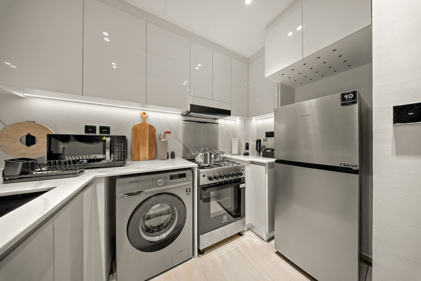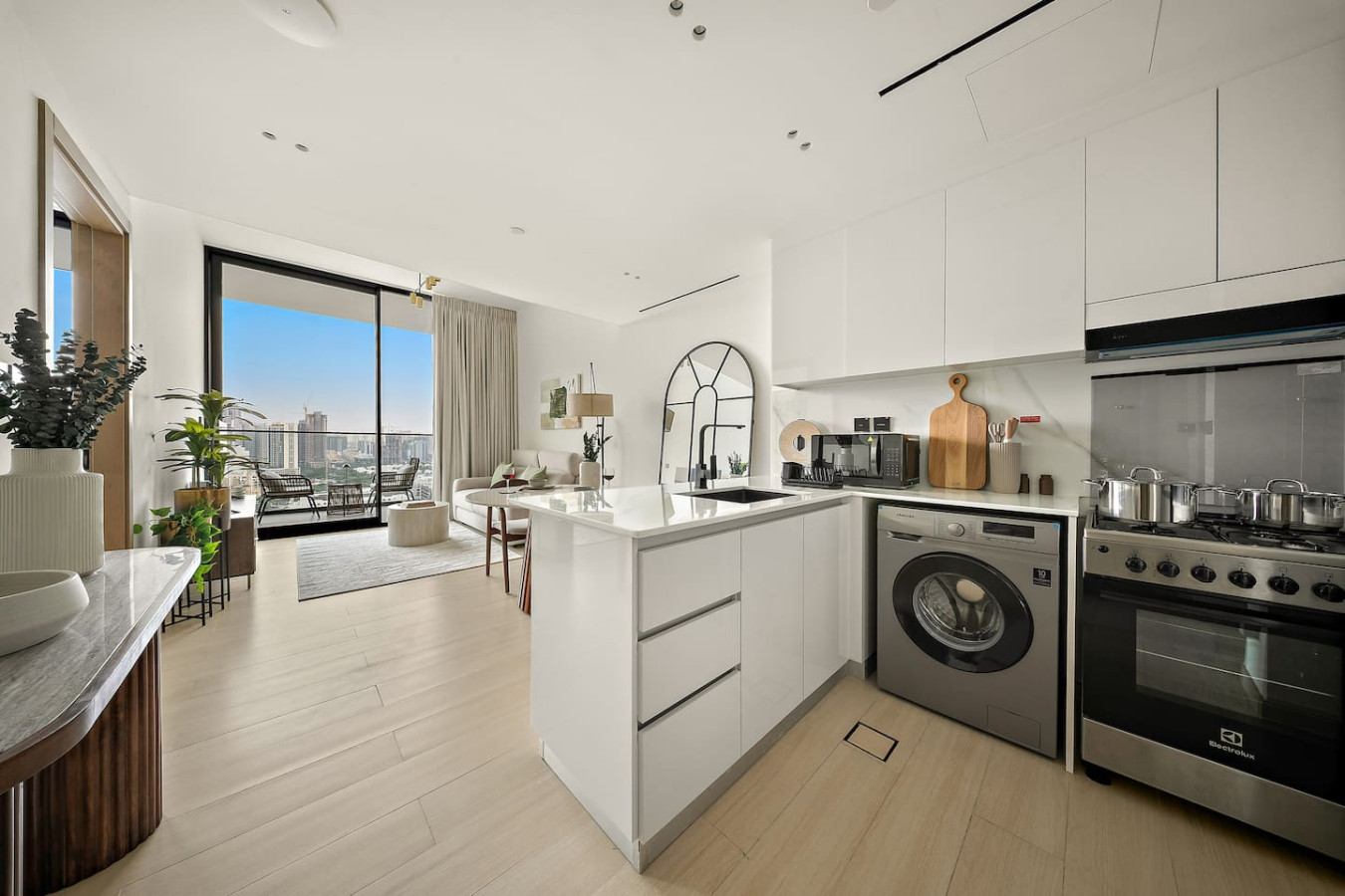It is fully equipped with stainless-steel cooking appliances that make it suitable for preparing any meal, whether a simple breakfast, quick snack or a three-course gourmet dinner. Spacious quartz countertops and a central kitchen island provide plenty of room to work your MasterChef magic.