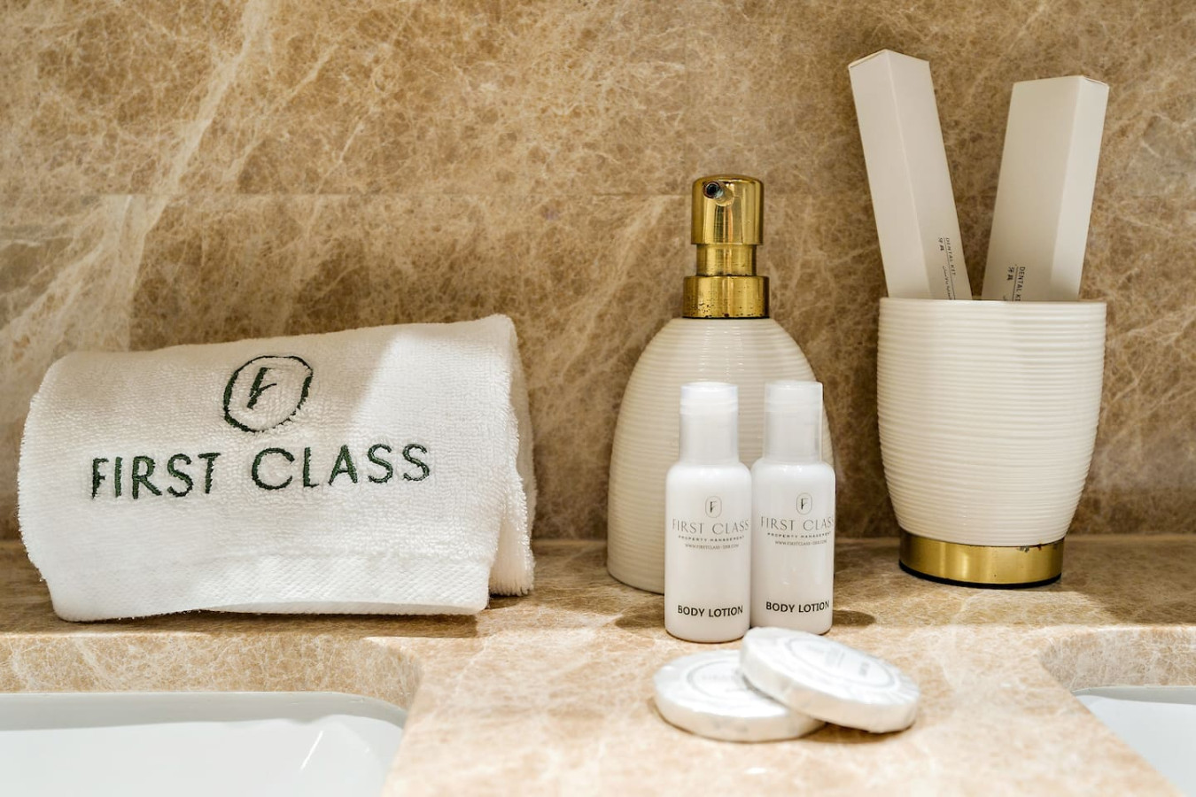 The bathroom is stocked with fresh towels and essential toiletries, so you don’t have to worry about bringing your own.