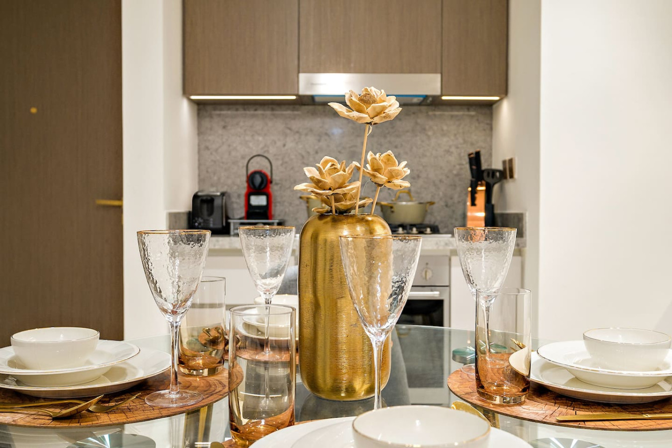 It is fully equipped with stainless-steel cooking appliances that make it suitable for preparing any meal, whether a simple breakfast, quick snack or a three-course gourmet dinner. Spacious quartz countertops and a central kitchen island provide plenty of room to work your MasterChef magic.
