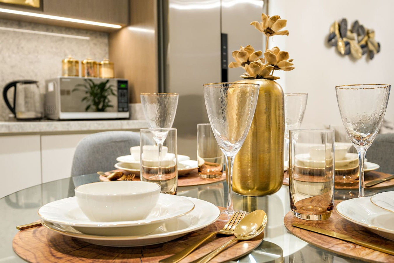 Have a few drinks in the living room while the food is getting ready. Once it’s done, serve it at the inviting dining table and enjoy a tasty meal with your loved ones.