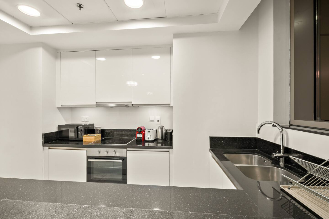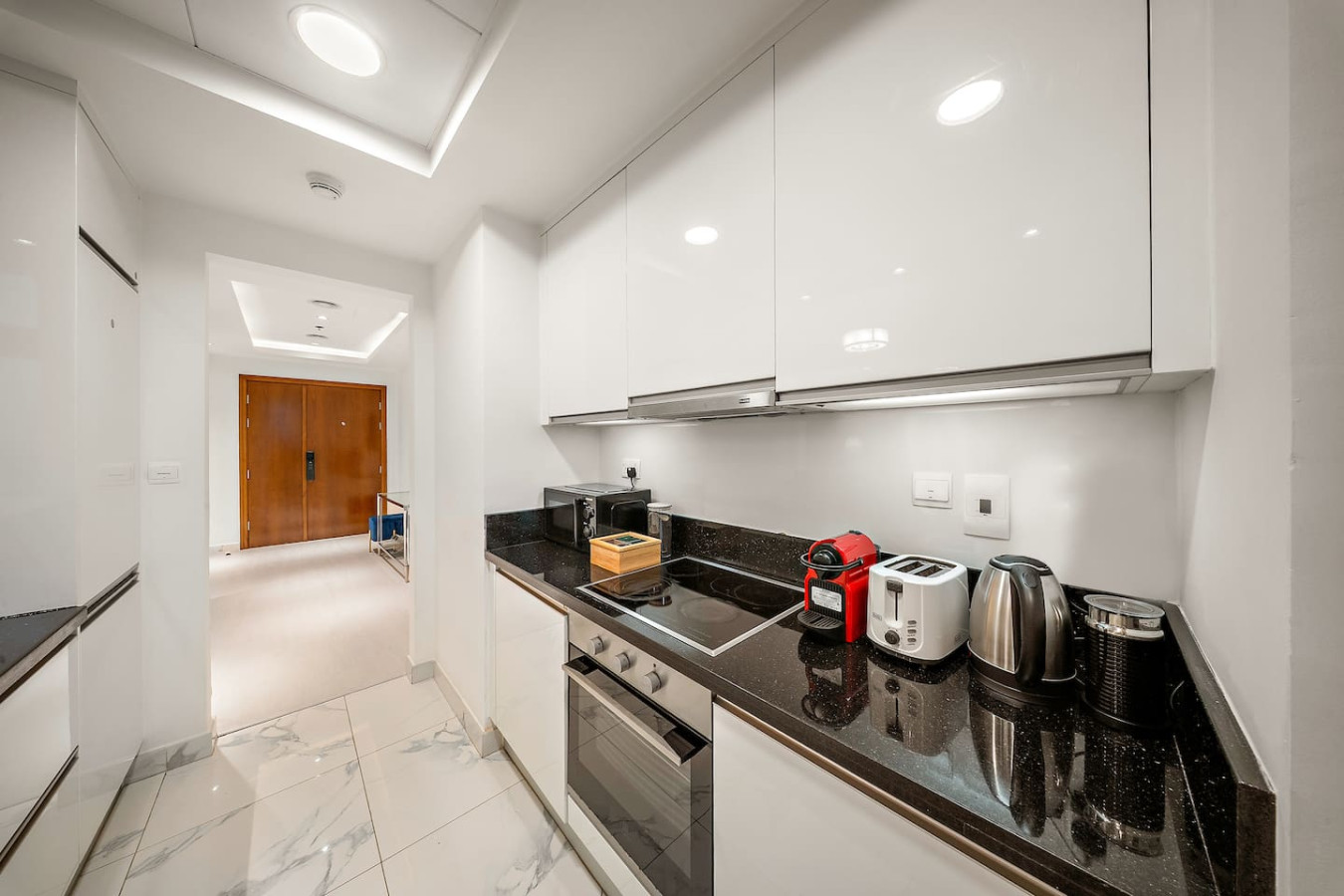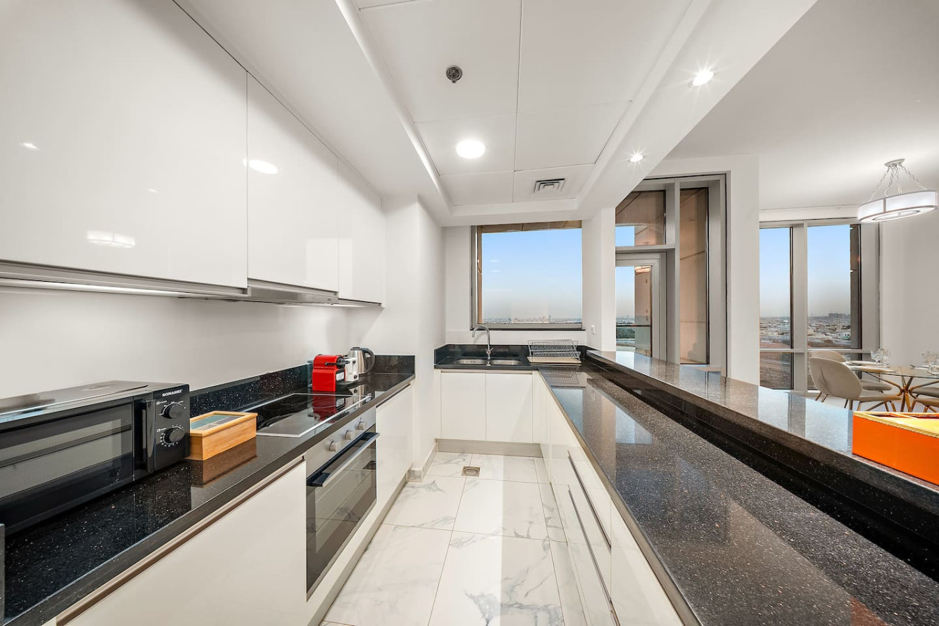It is fully equipped with stainless-steel cooking appliances that make it suitable for preparing any meal, whether a simple breakfast, quick snack or a three-course gourmet dinner. Spacious quartz countertops and a central kitchen island provide plenty of room to work your MasterChef magic.
