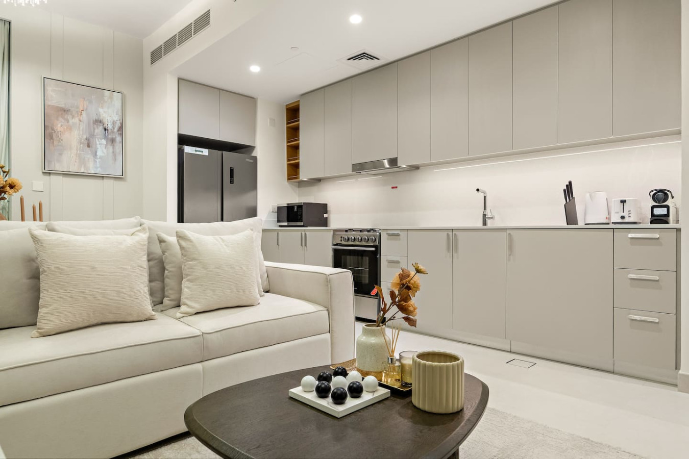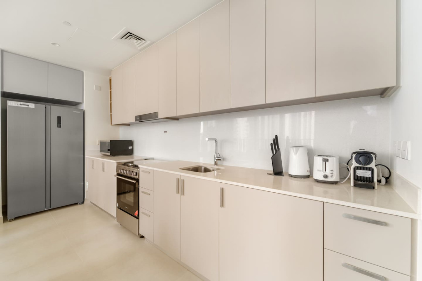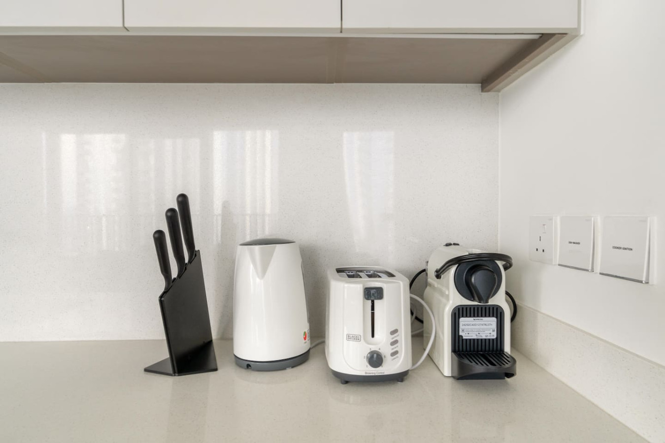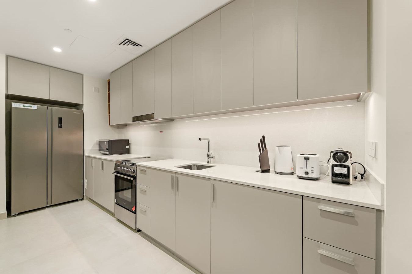 It is fully equipped with stainless-steel cooking appliances that make it suitable for preparing any meal, whether a simple breakfast, quick snack or a three-course gourmet dinner. Spacious quartz countertops and a central kitchen island provide plenty of room to work your MasterChef magic.
