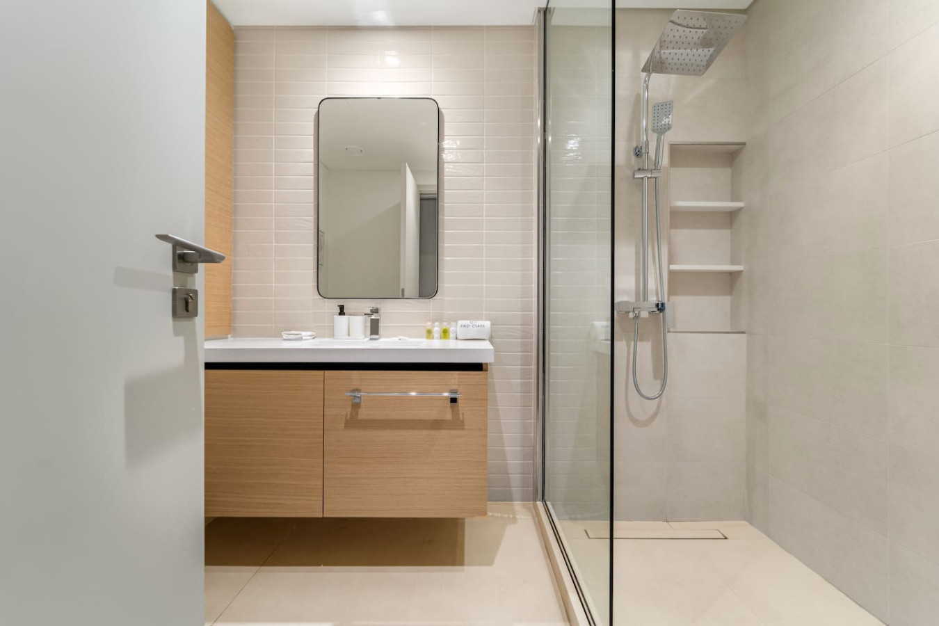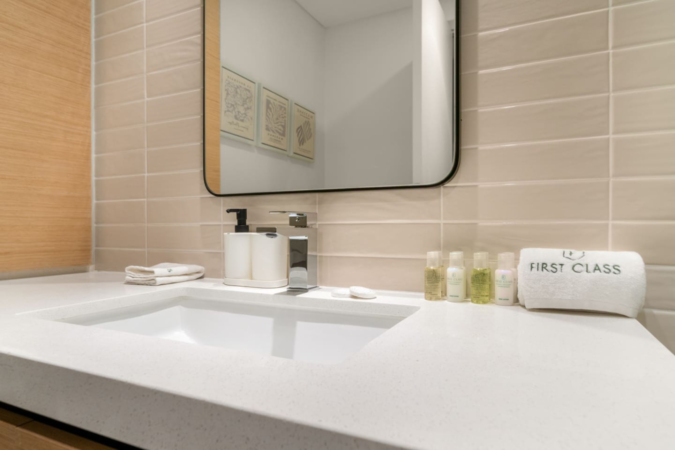 The bathroom is stocked with fresh towels and essential toiletries, so you don’t have to worry about bringing your own.