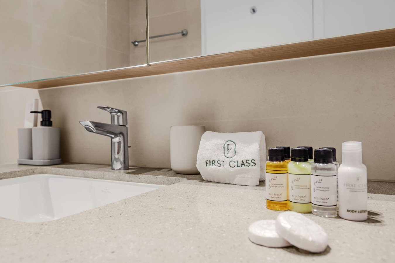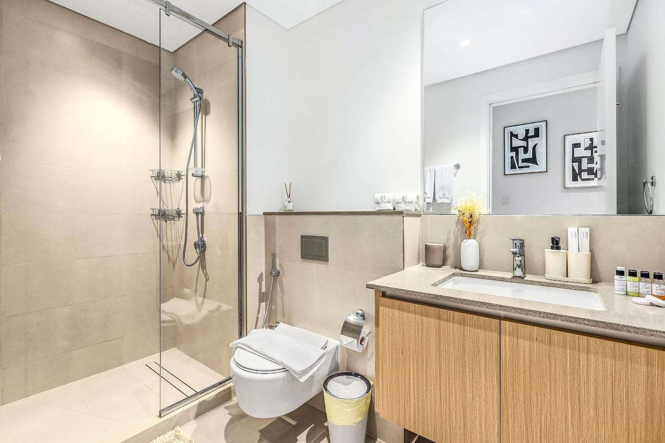 The bathroom is stocked with fresh towels and essential toiletries, so you don’t have to worry about bringing your own.