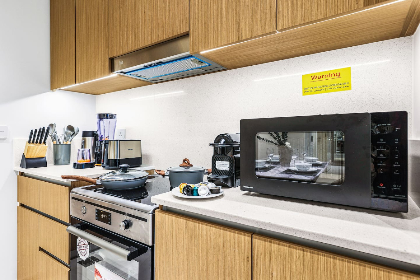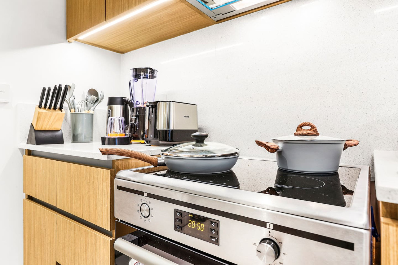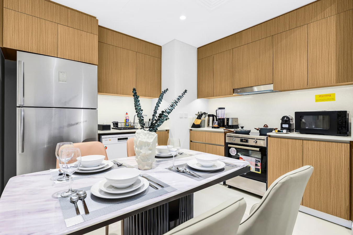 It is fully equipped with stainless-steel cooking appliances that make it suitable for preparing any meal, whether a simple breakfast, quick snack or a three-course gourmet dinner