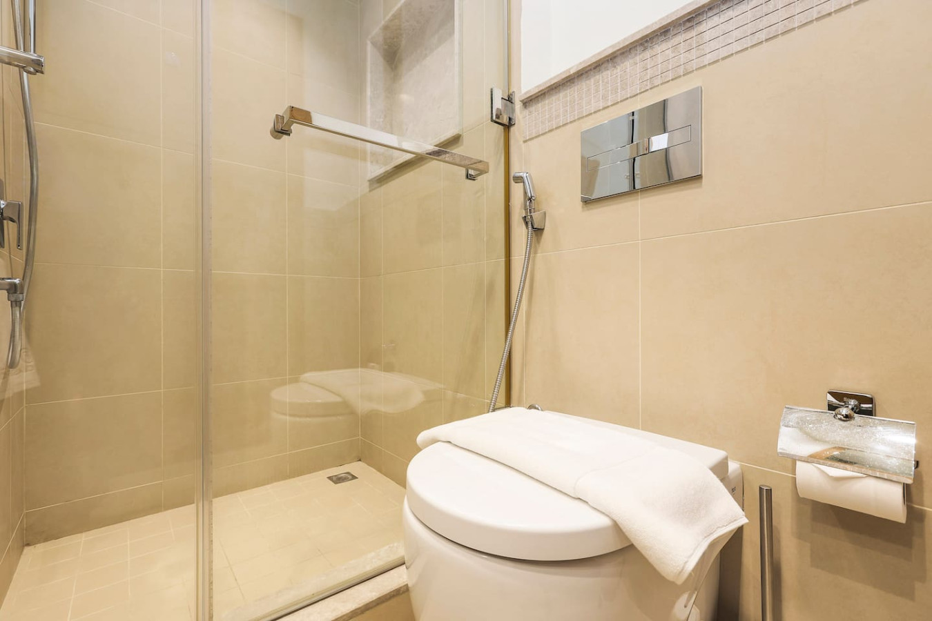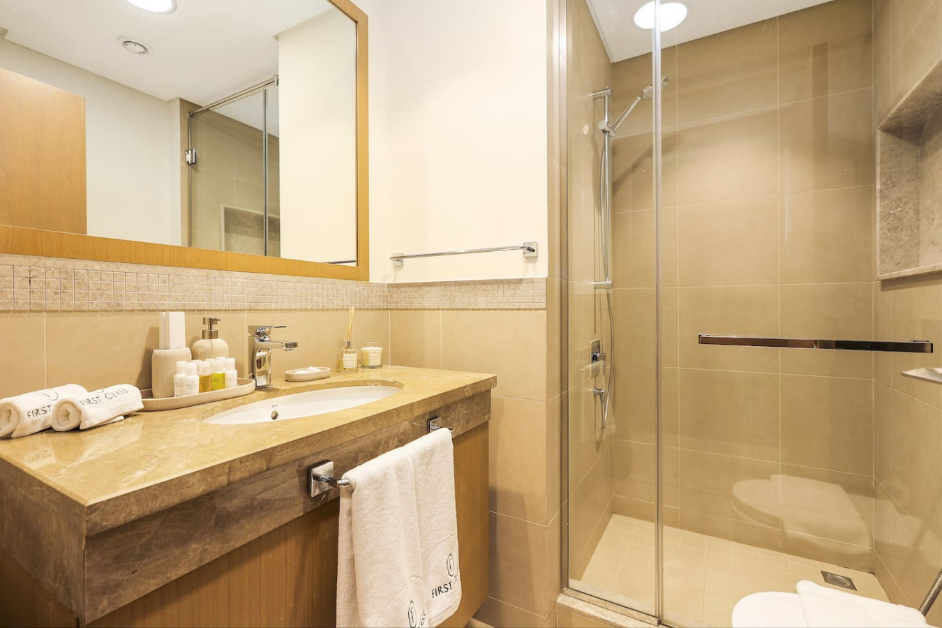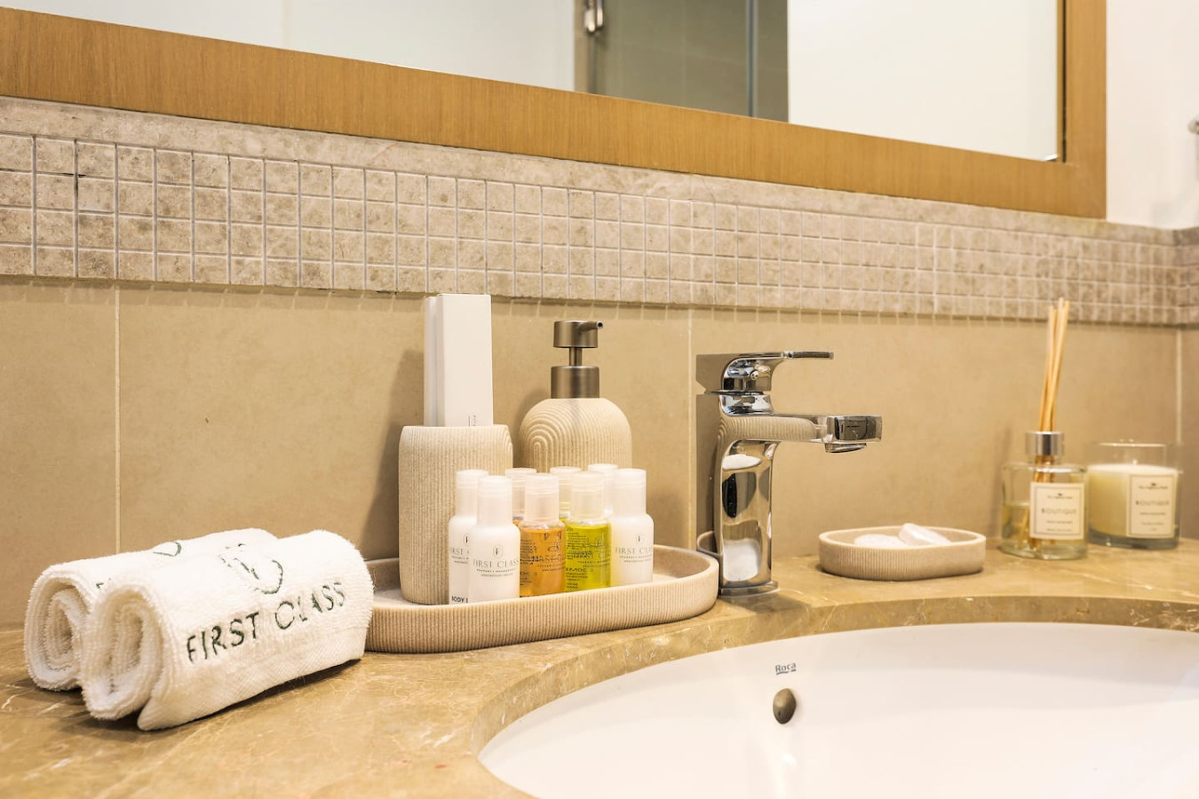 The bathroom is stocked with fresh towels and essential toiletries, so you don’t have to worry about bringing your own.