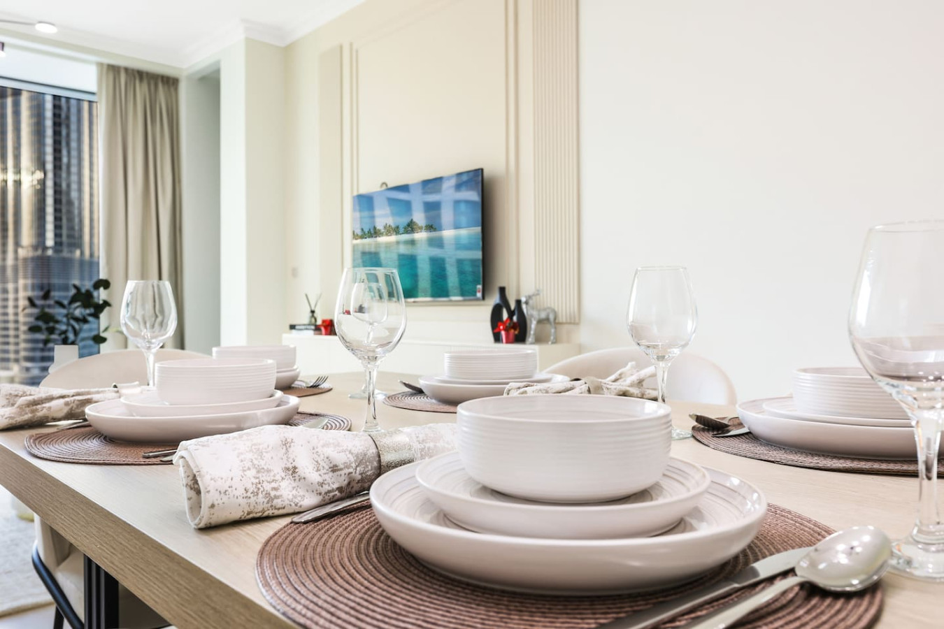 Have a few drinks in the living room while the food is getting ready. Once it’s done, serve it at the inviting dining table and enjoy a tasty meal with your loved ones.