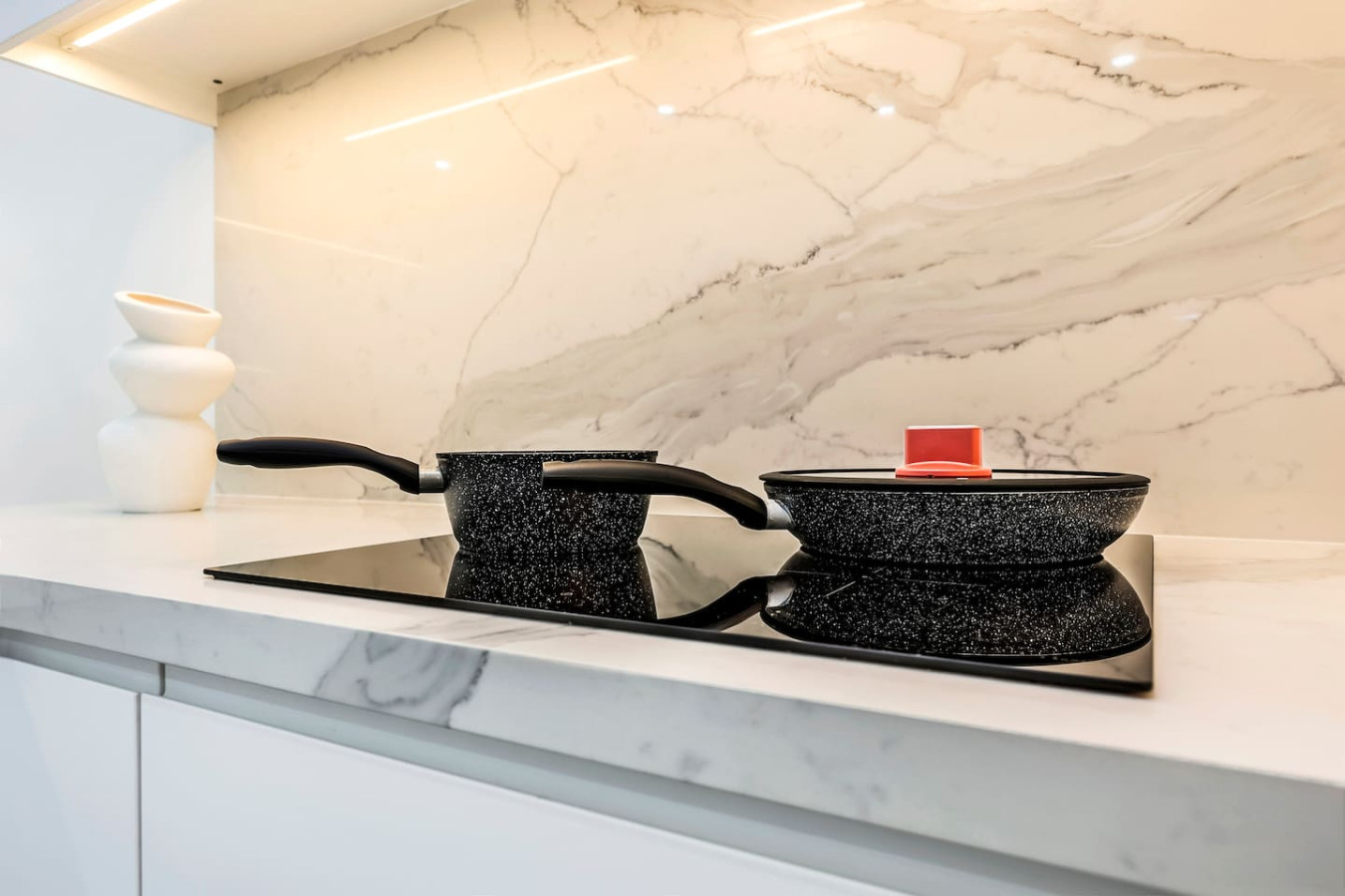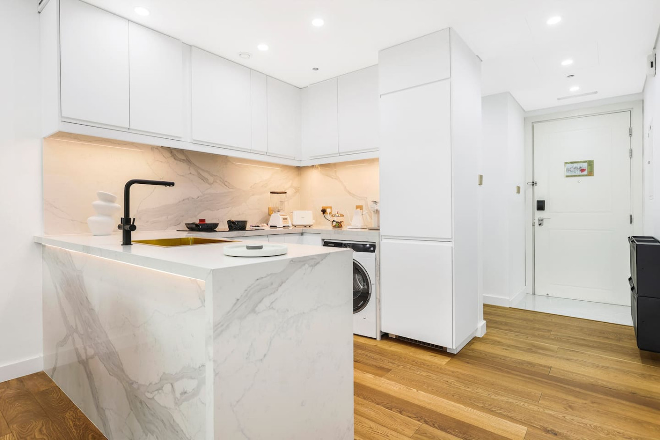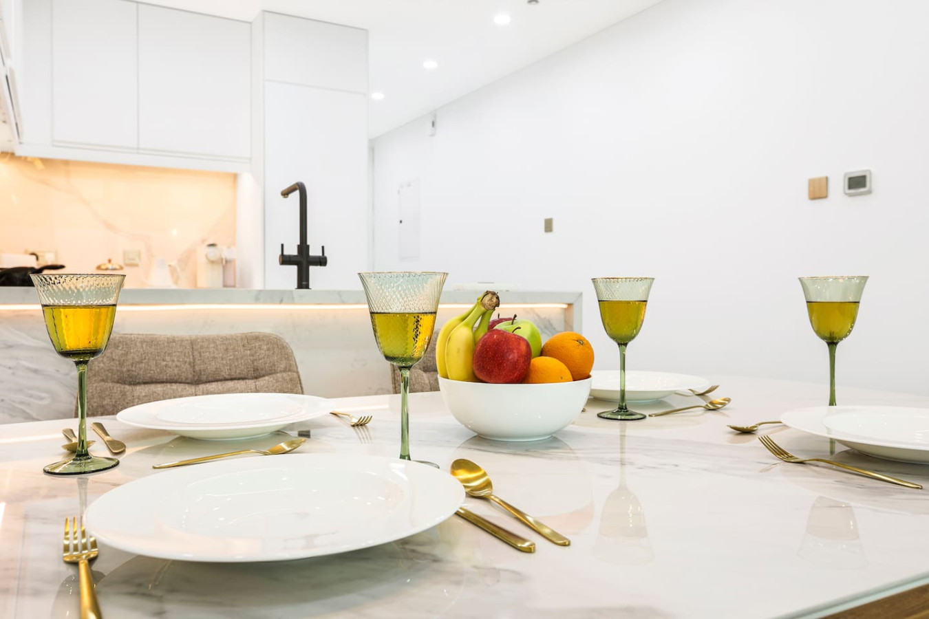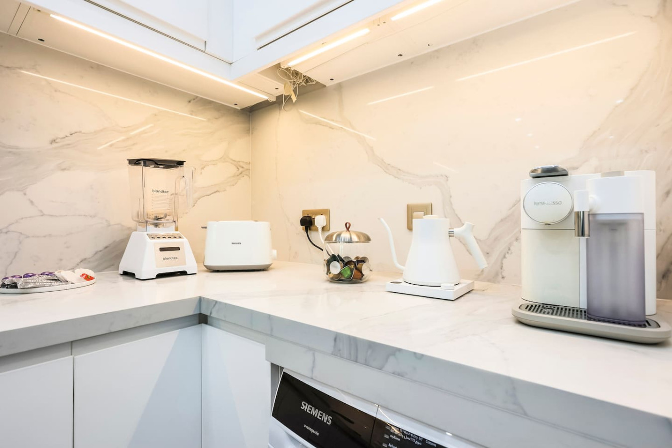 It is fully equipped with stainless-steel cooking appliances that make it suitable for preparing any meal, whether a simple breakfast, quick snack or a three-course gourmet dinner. Spacious quartz countertops and a central kitchen island provide plenty of room to work your MasterChef magic.
