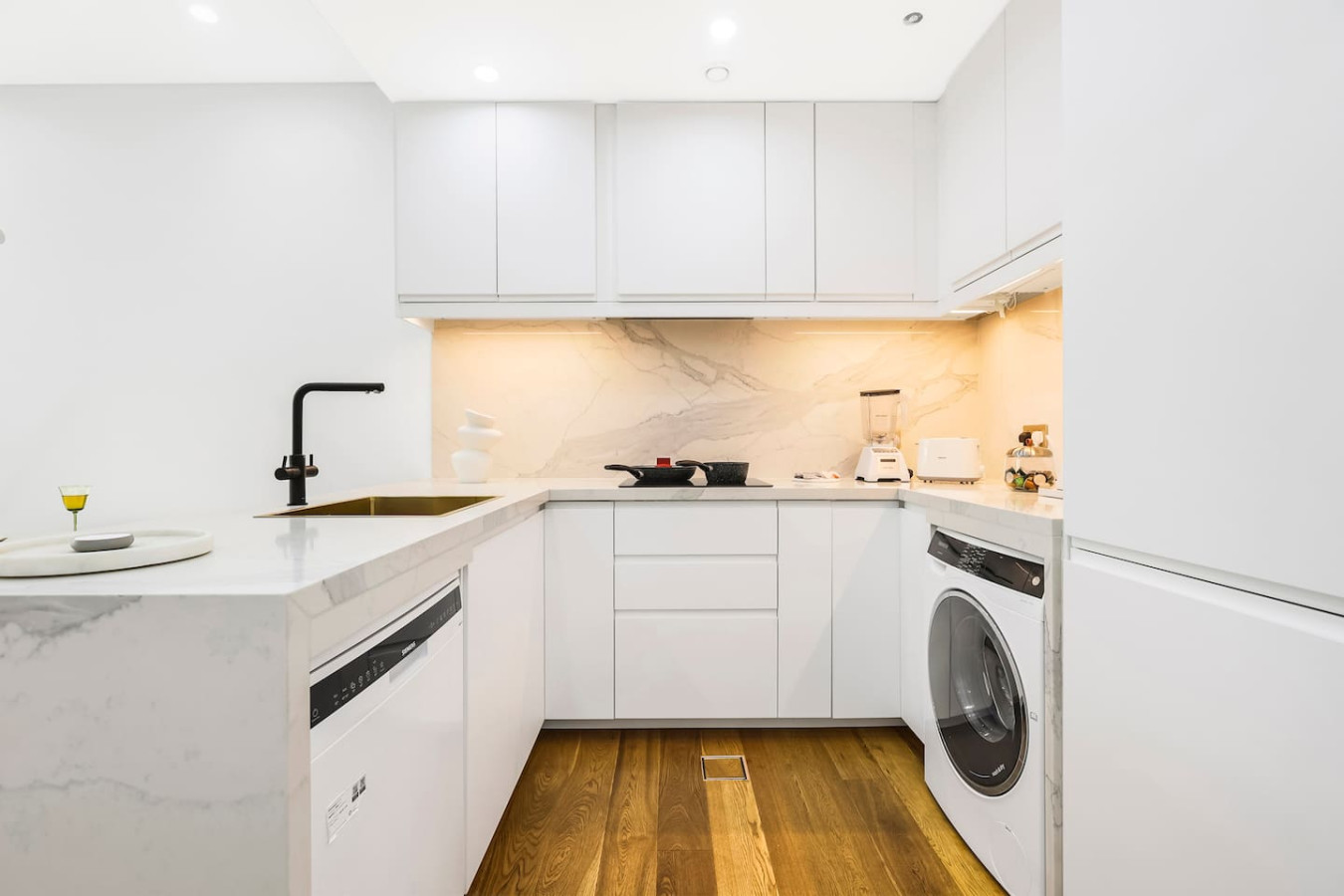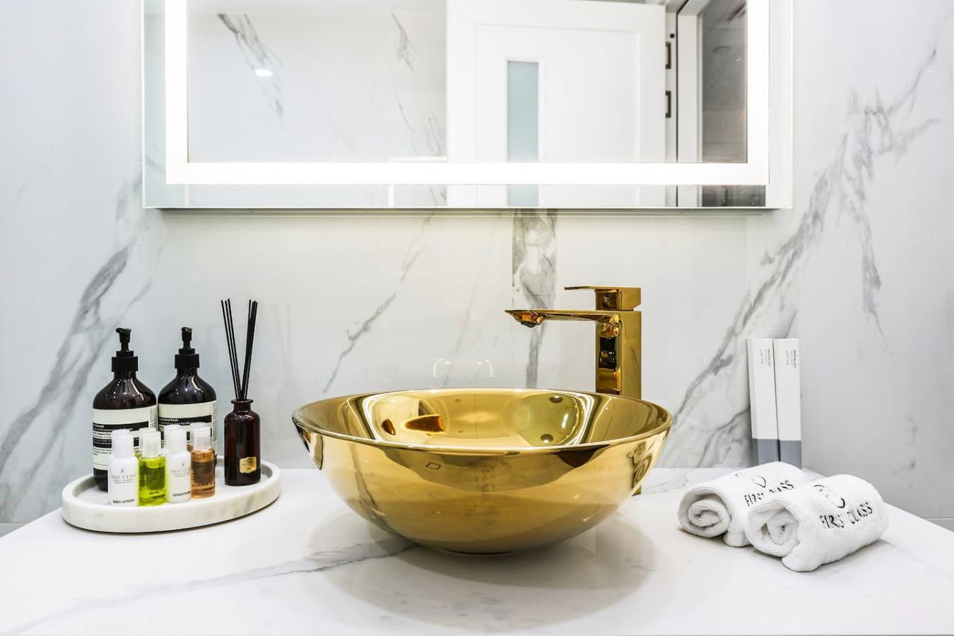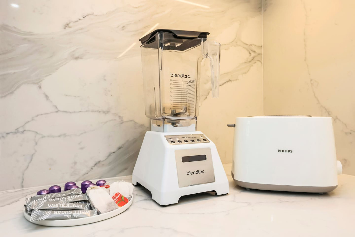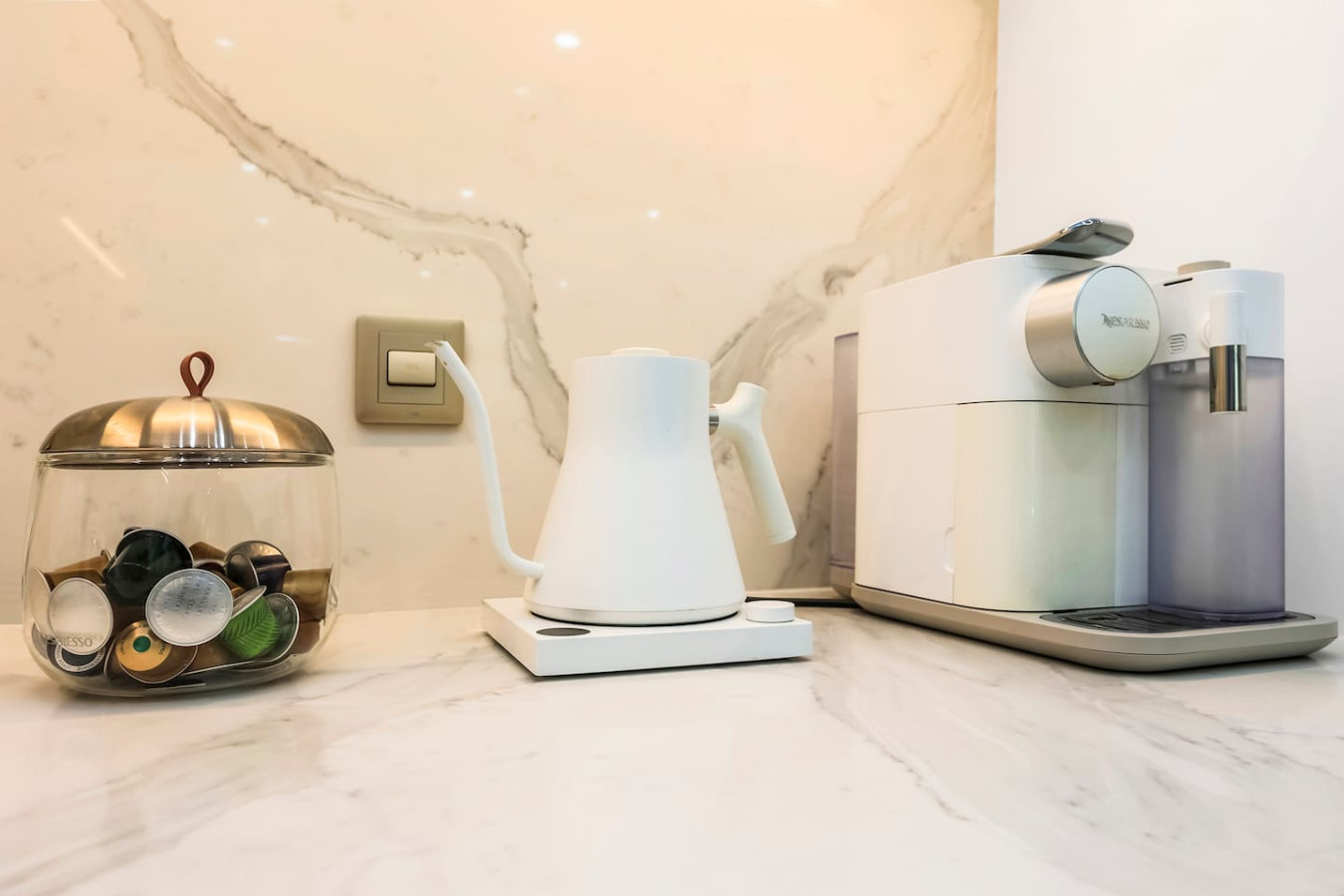 It is fully equipped with stainless-steel cooking appliances that make it suitable for preparing any meal, whether a simple breakfast, quick snack or a three-course gourmet dinner. Spacious quartz countertops and a central kitchen island provide plenty of room to work your MasterChef magic.